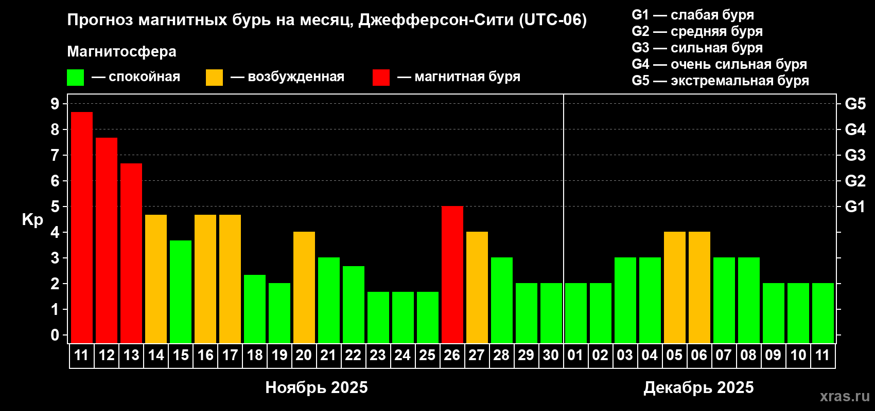 Прогноз магнитных бурь Джефферсон-Сити на 11 ноября 2025 года
