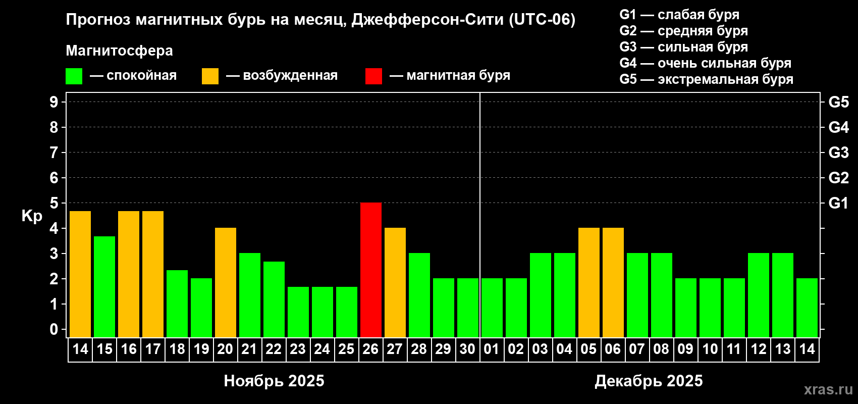 Прогноз магнитных бурь Джефферсон-Сити на 14 ноября 2025 года