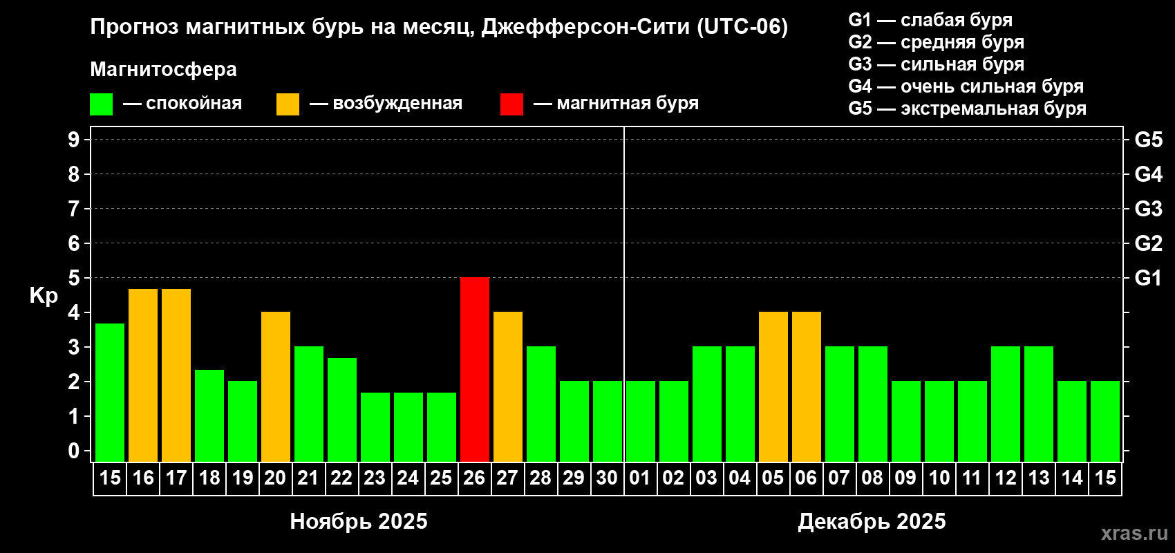 Прогноз магнитных бурь Джефферсон-Сити на 15 ноября 2025 года