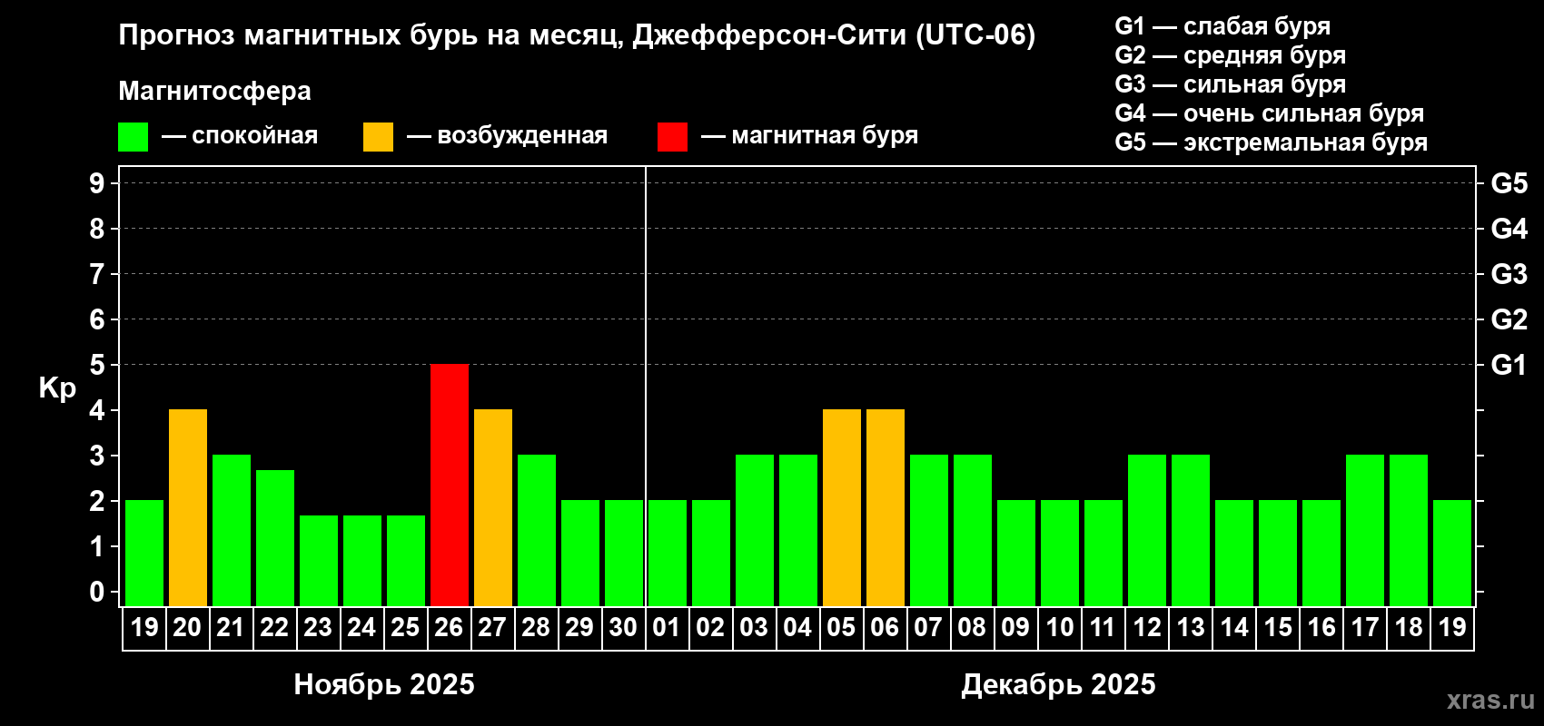 Прогноз магнитных бурь Джефферсон-Сити на 19 ноября 2025 года