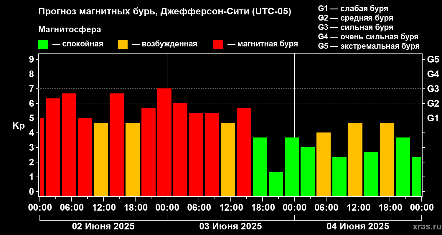 Прогноз магнитных бурь Джефферсон-Сити на 2 июня 2025 года