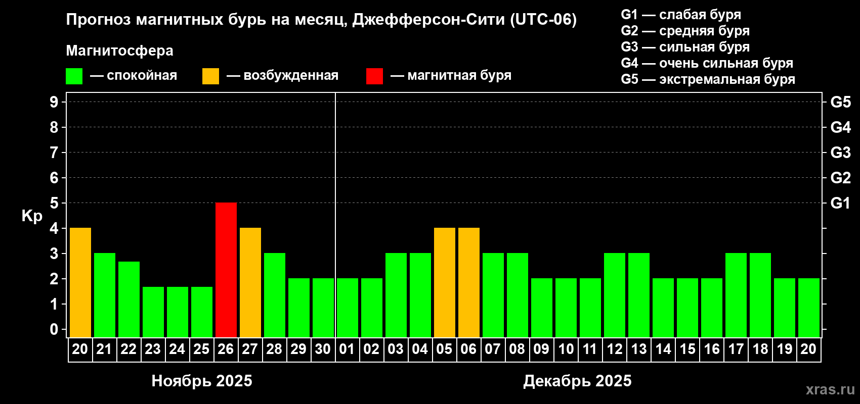 Прогноз магнитных бурь Джефферсон-Сити на 20 ноября 2025 года