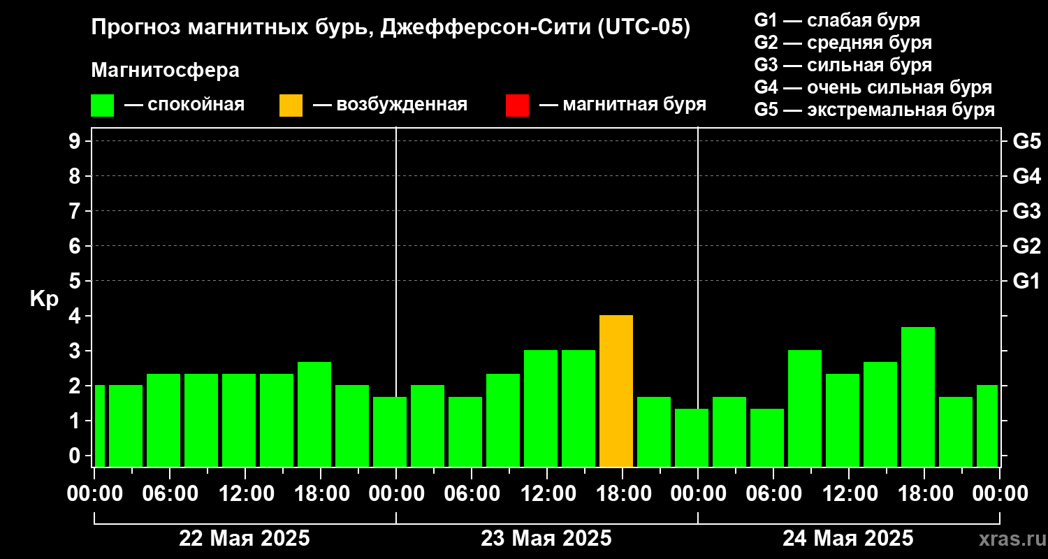 Прогноз магнитных бурь Джефферсон-Сити на 22 мая 2025 года