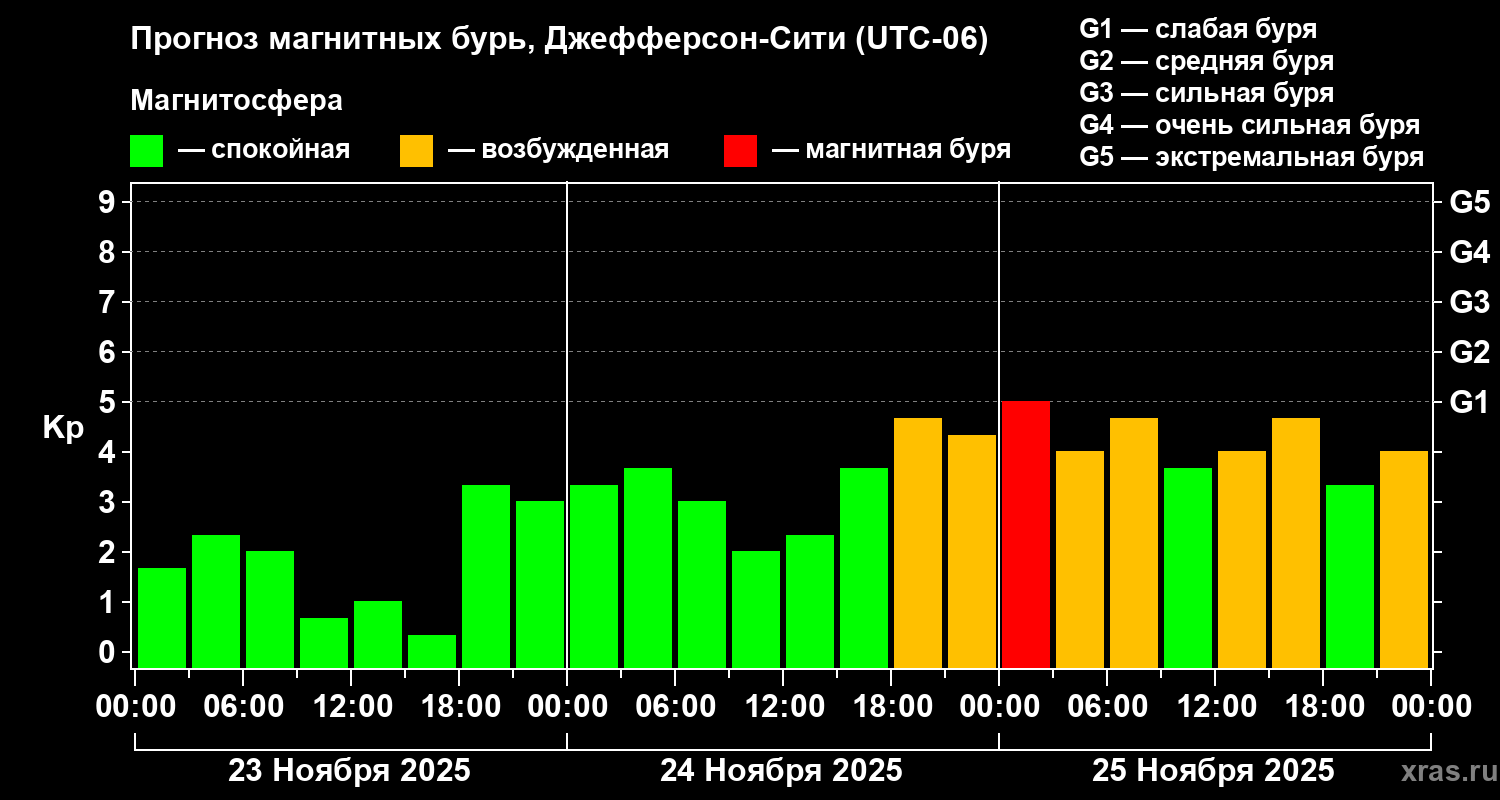 Прогноз магнитных бурь Джефферсон-Сити на 23 ноября 2025 года