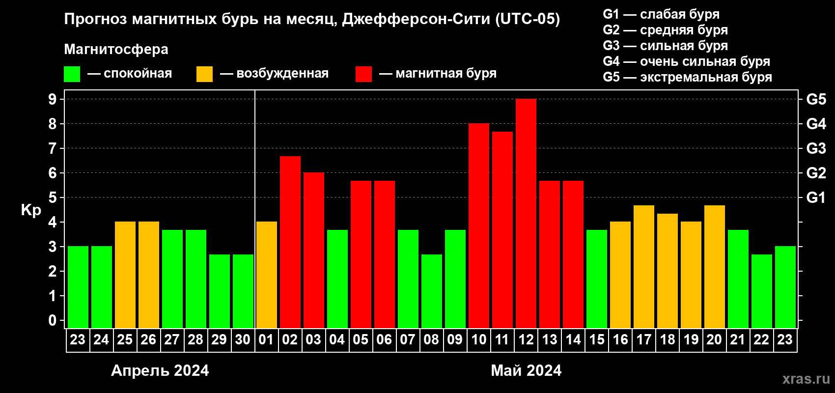 Прогноз магнитных бурь Джефферсон-Сити на 23 апреля 2024 года