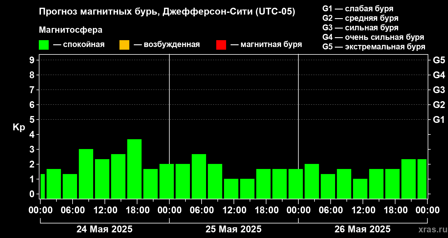 Прогноз магнитных бурь Джефферсон-Сити на 24 мая 2025 года
