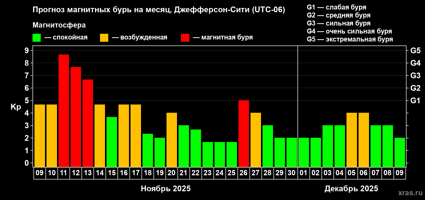 Прогноз магнитных бурь Джефферсон-Сити на 9 ноября 2025 года