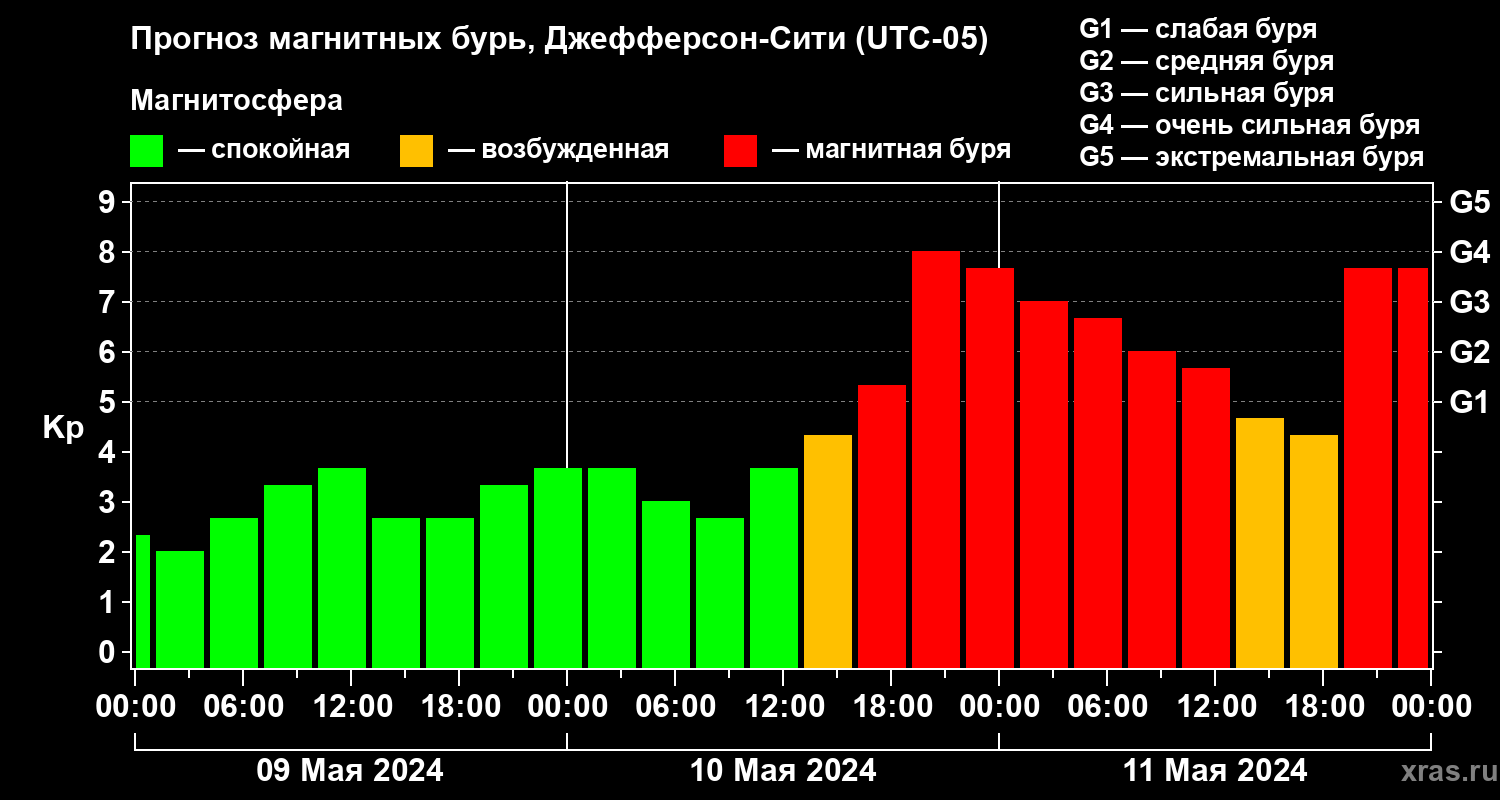 Прогноз магнитных бурь Джефферсон-Сити на 9 мая 2024 года