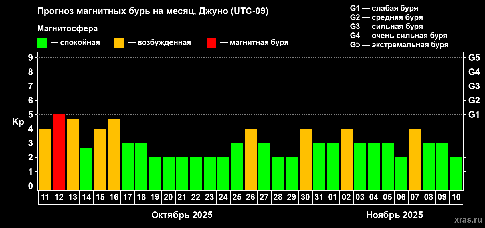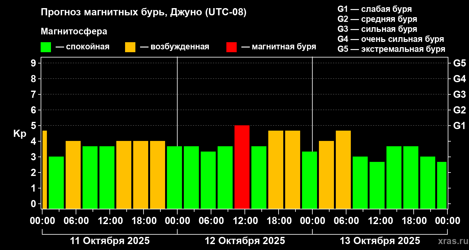 Прогноз магнитных бурь Джуно на 11 октября 2025 года
