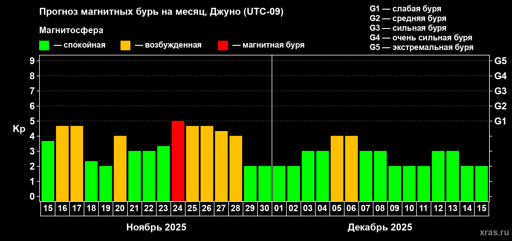 Прогноз магнитных бурь Джуно — 15 ноября 2025 года