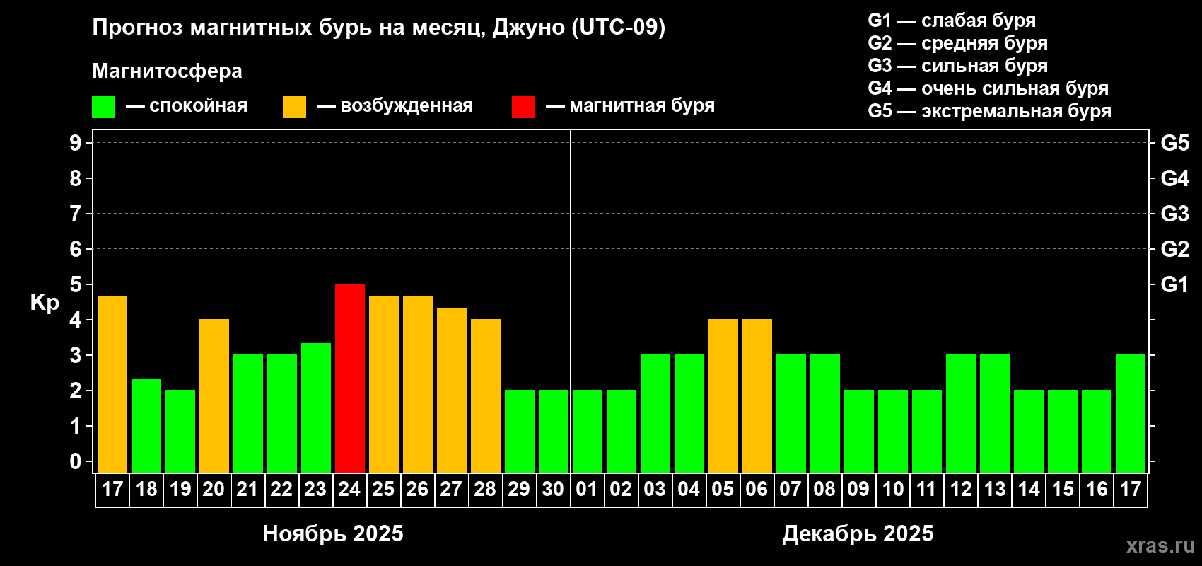 Прогноз магнитных бурь Джуно на 17 ноября 2025 года