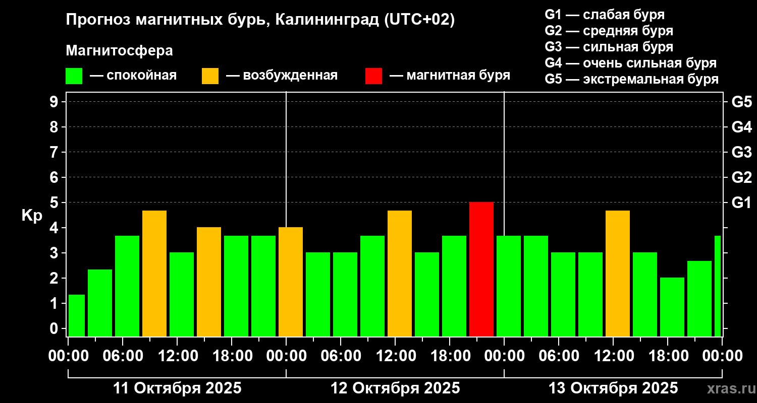 Прогноз магнитных бурь в Калининграде — 11 октября 2025 года