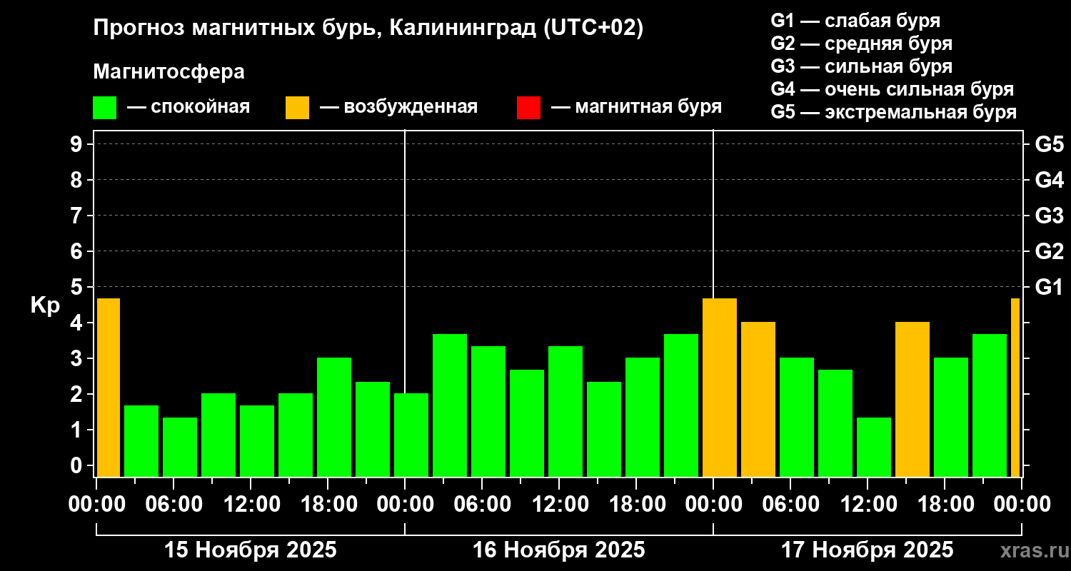 Прогноз магнитных бурь в Калининграде — 15 ноября 2025 года