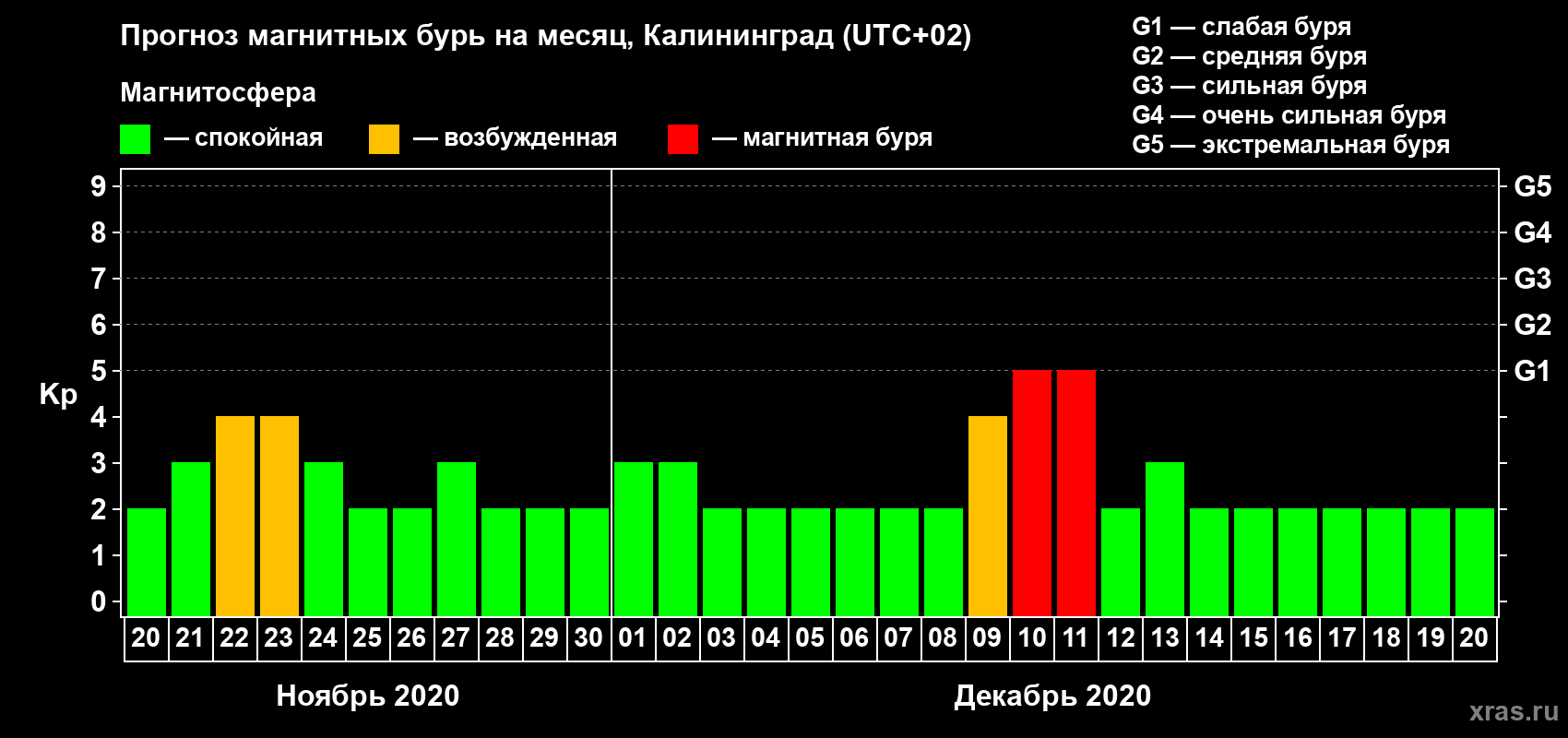 Прогноз магнитных бурь в Калининграде на 20 ноября 2020 года
