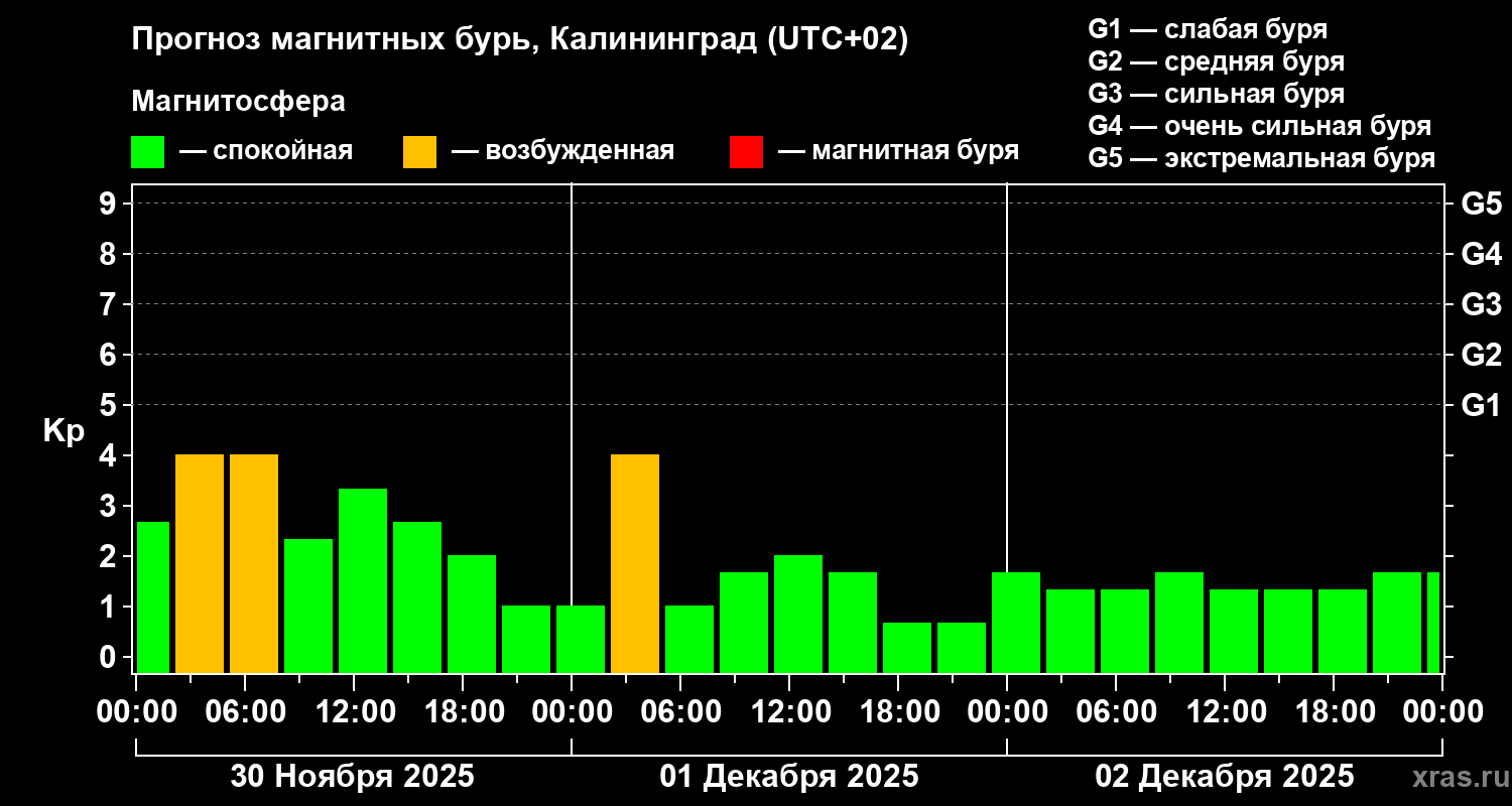 Прогноз магнитных бурь в Калининграде на 30 ноября 2025 года