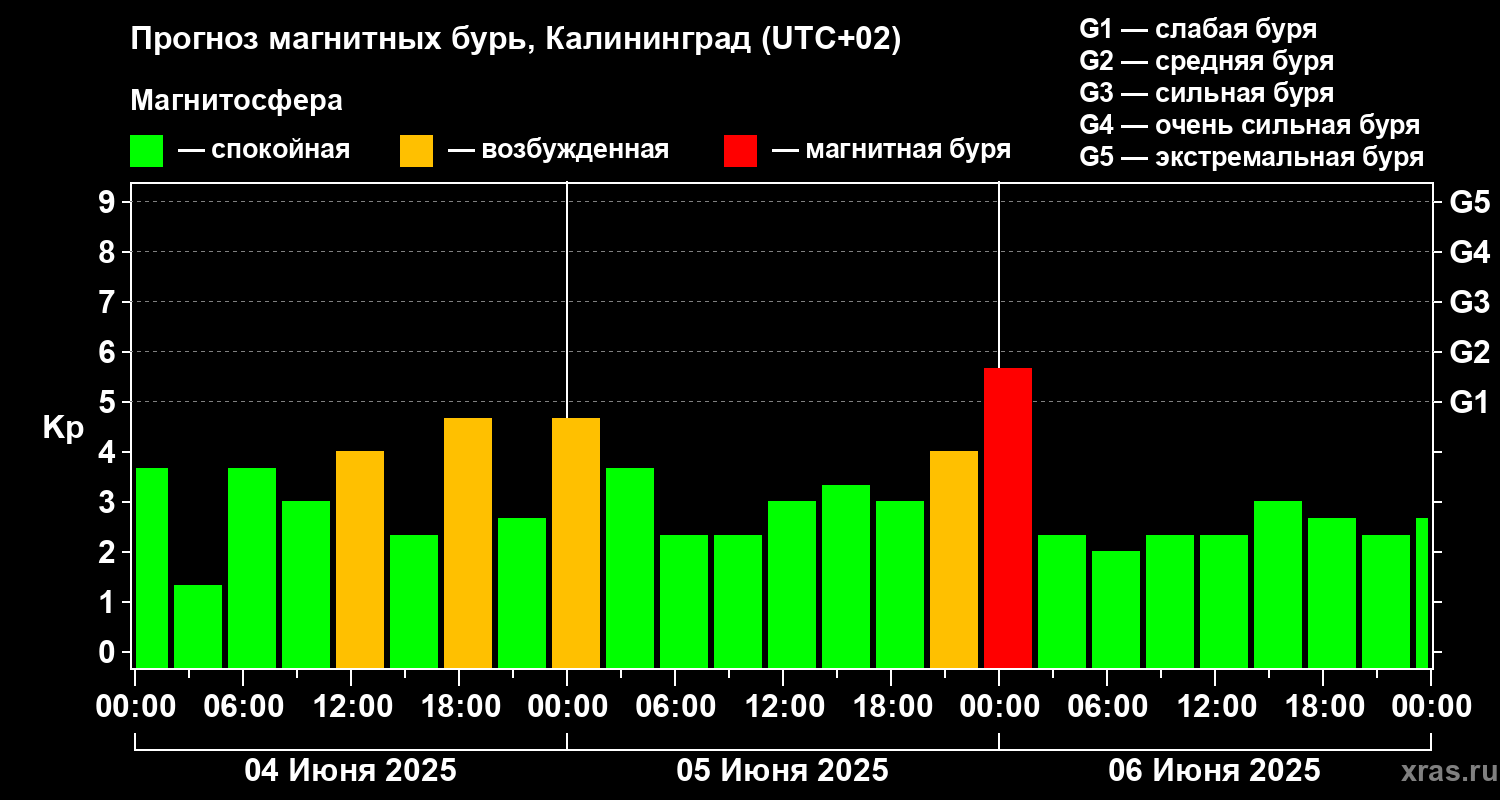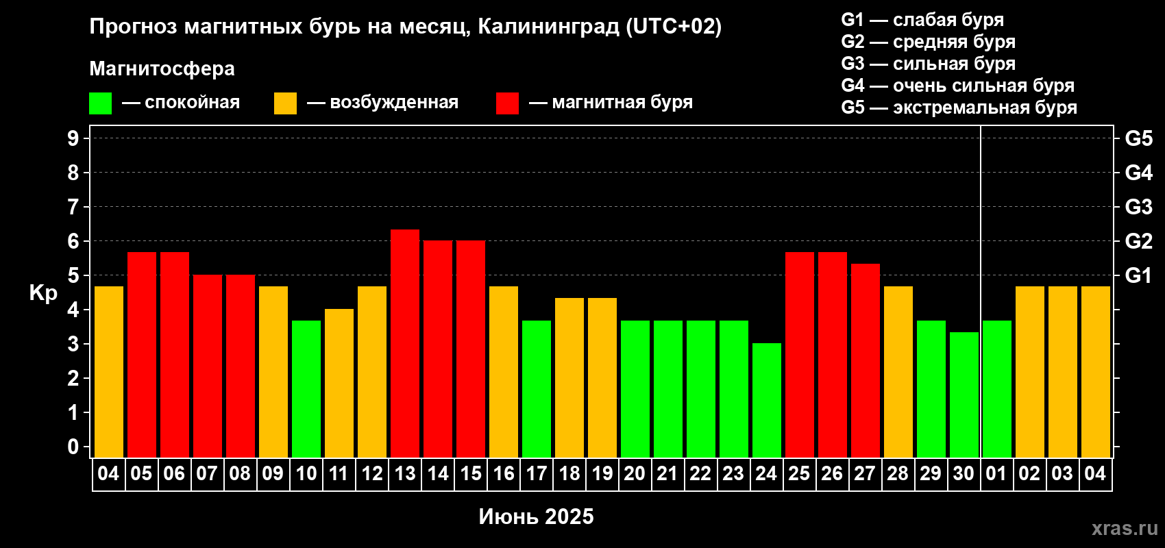 Прогноз магнитных бурь в Калининграде на 4 июня 2025 года