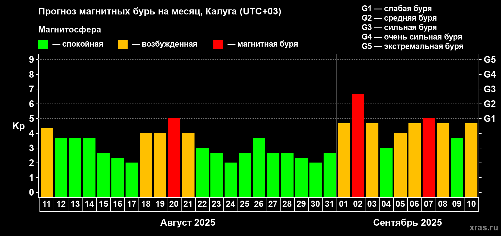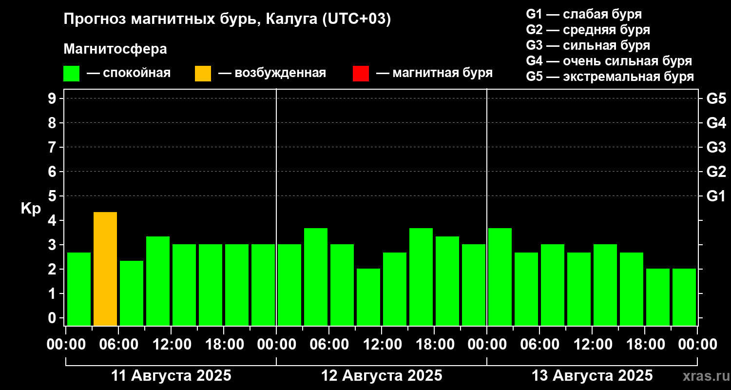Прогноз магнитных бурь в Калуге — 11 августа 2025 года