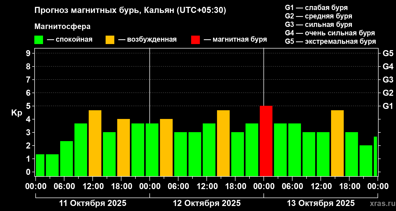 Прогноз магнитных бурь в Кальяне на 11 октября 2025 года