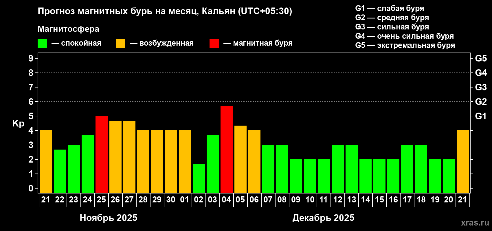 Прогноз магнитных бурь в Кальяне — 21 ноября 2025 года