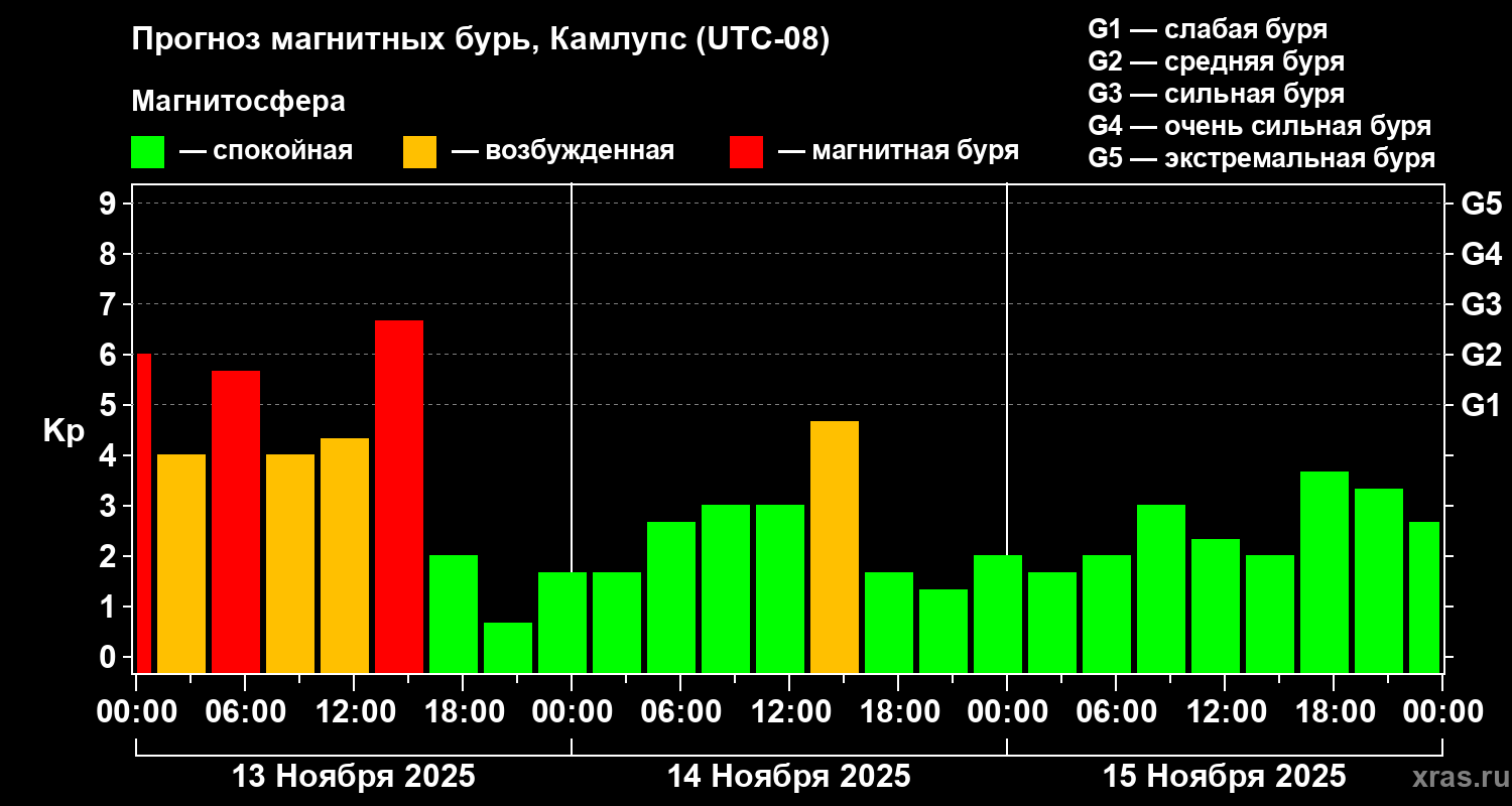 Прогноз магнитных бурь в Камлупсе на 13 ноября 2025 года