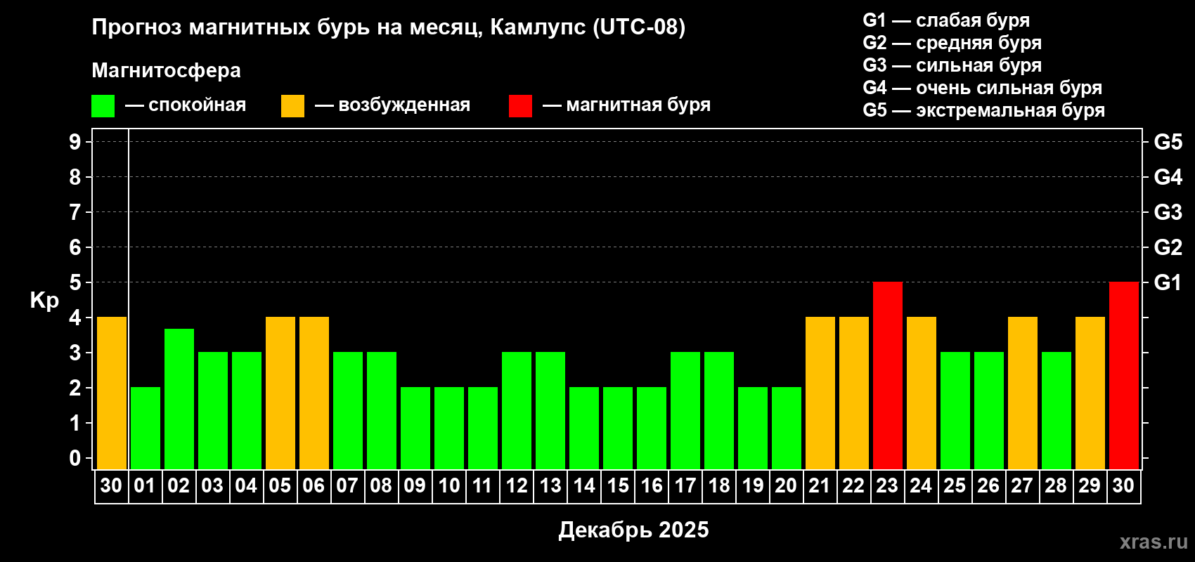 Прогноз магнитных бурь в Камлупсе — 30 ноября 2025 года