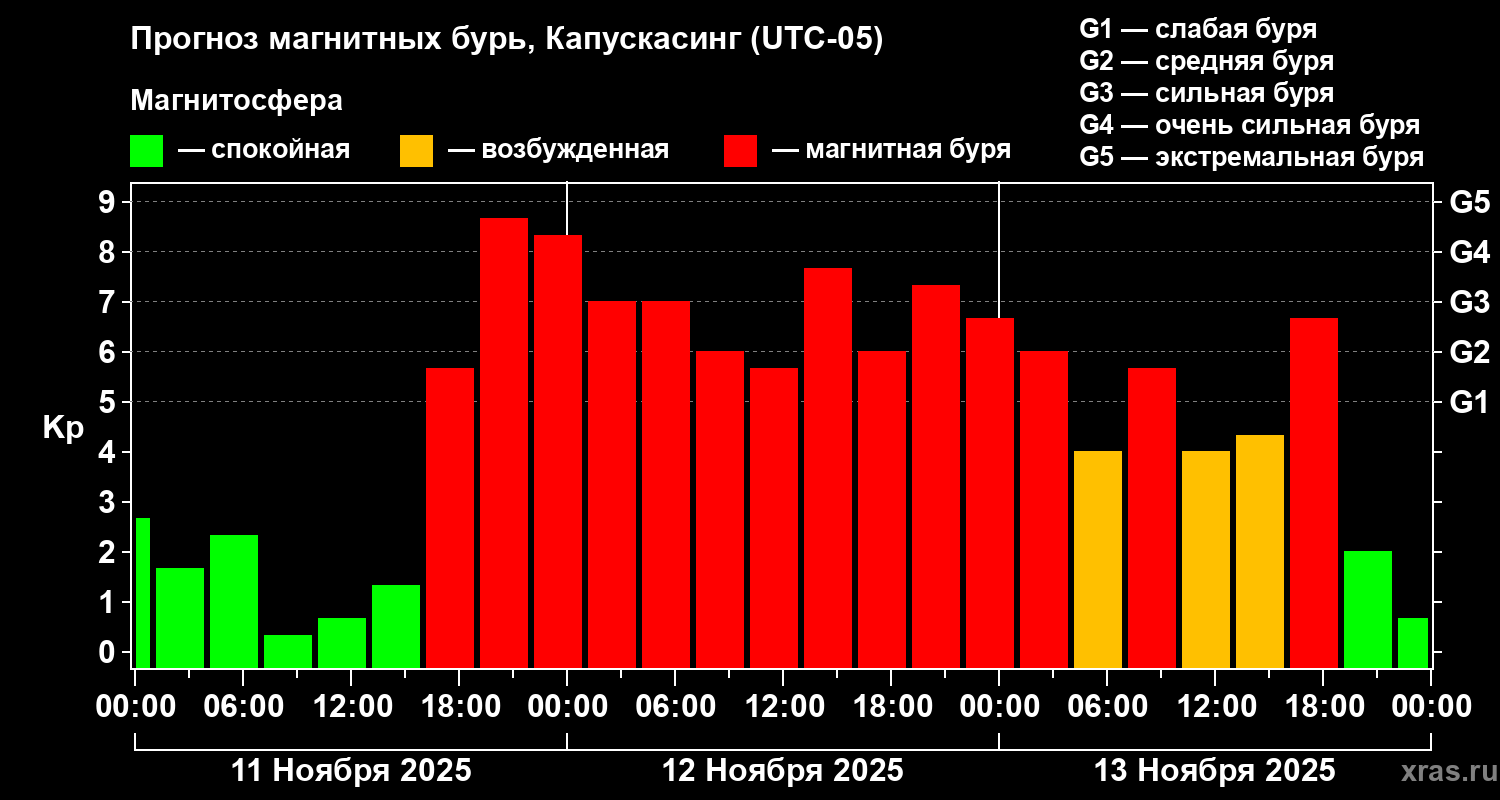Прогноз магнитных бурь в Капускасинге — 11 ноября 2025 года