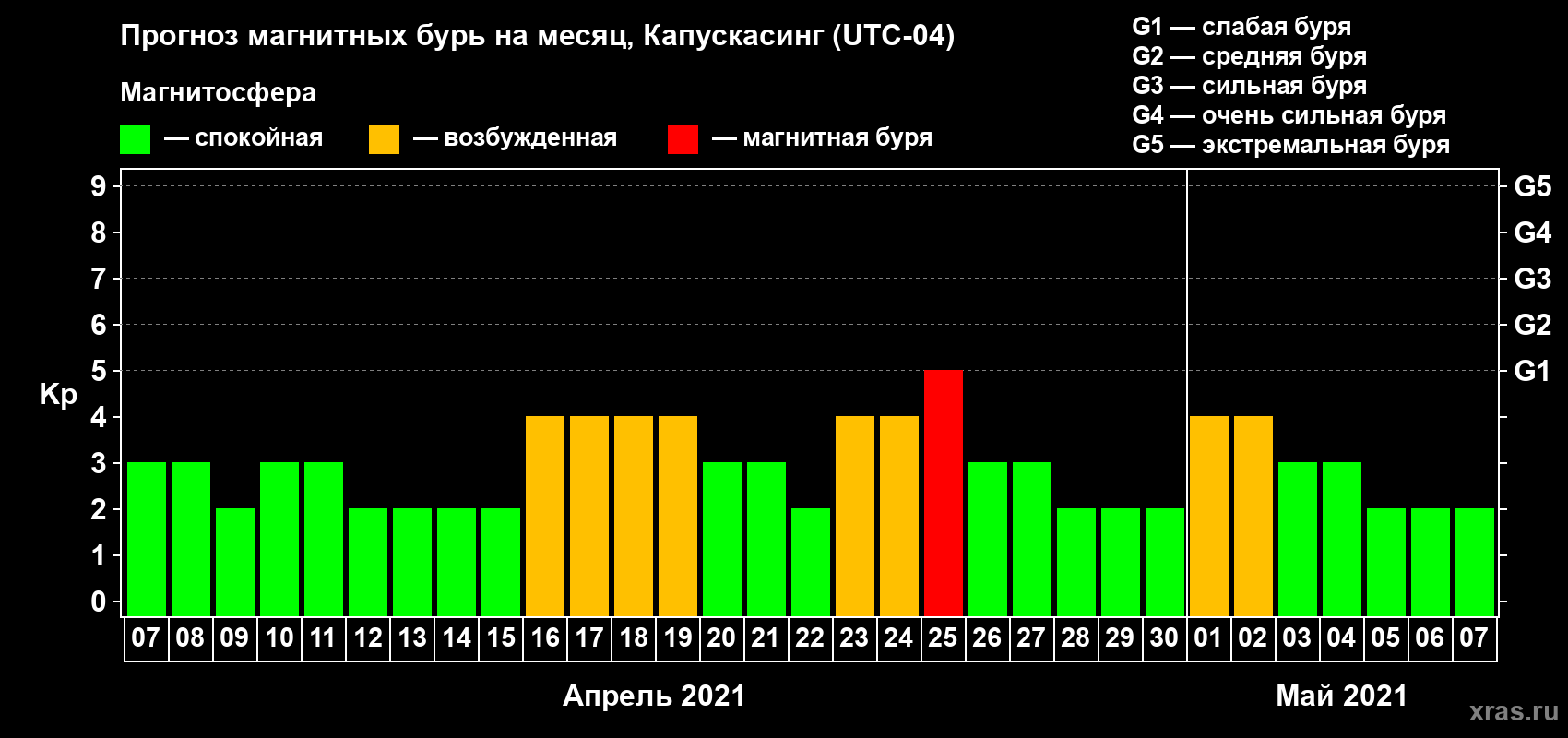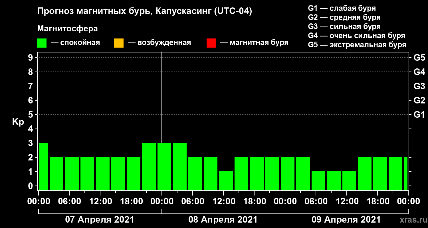 Прогноз магнитных бурь в Капускасинге на 7 апреля 2021 года