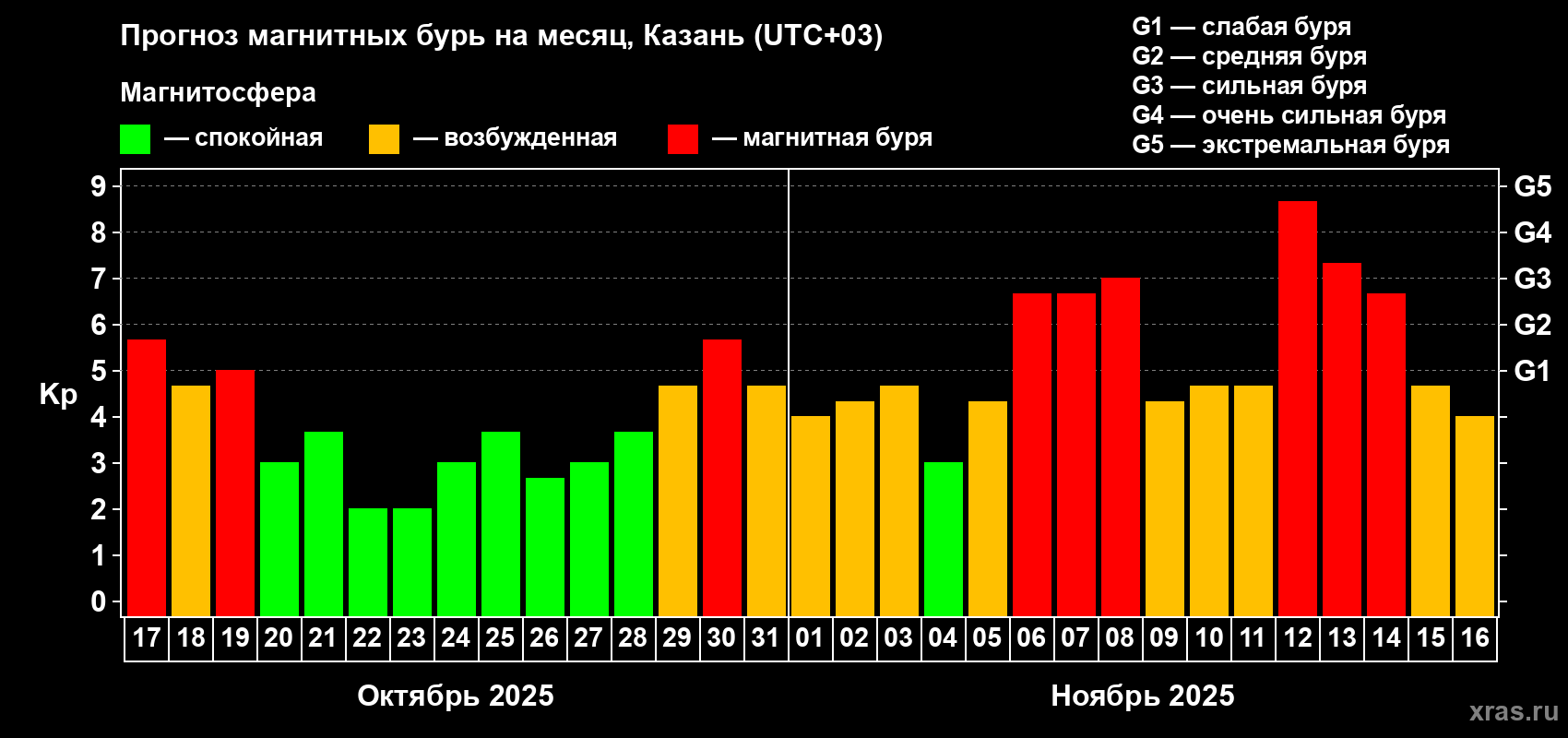 Прогноз магнитных бурь Казани — 17 октября 2025 года