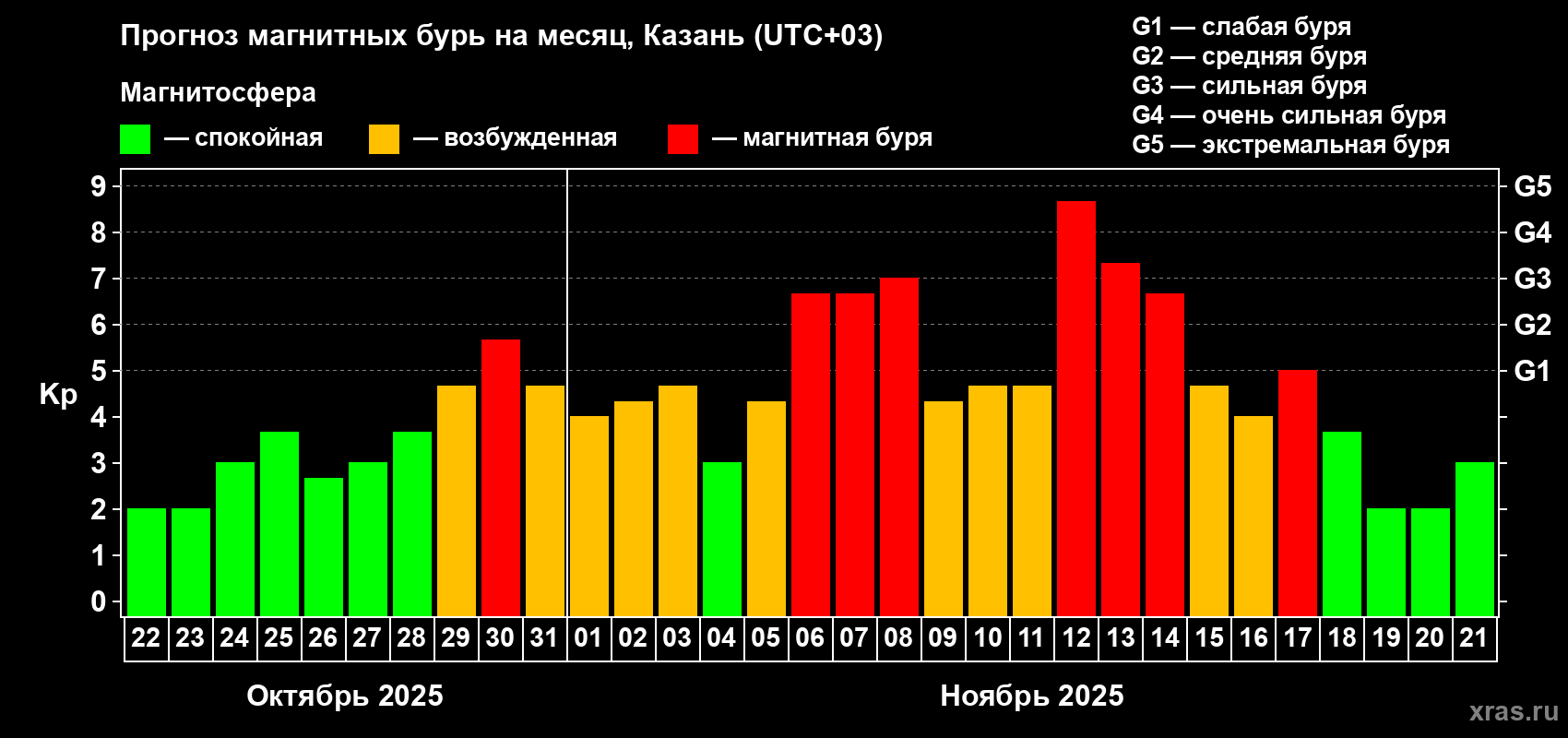 Прогноз магнитных бурь Казани — 22 октября 2025 года