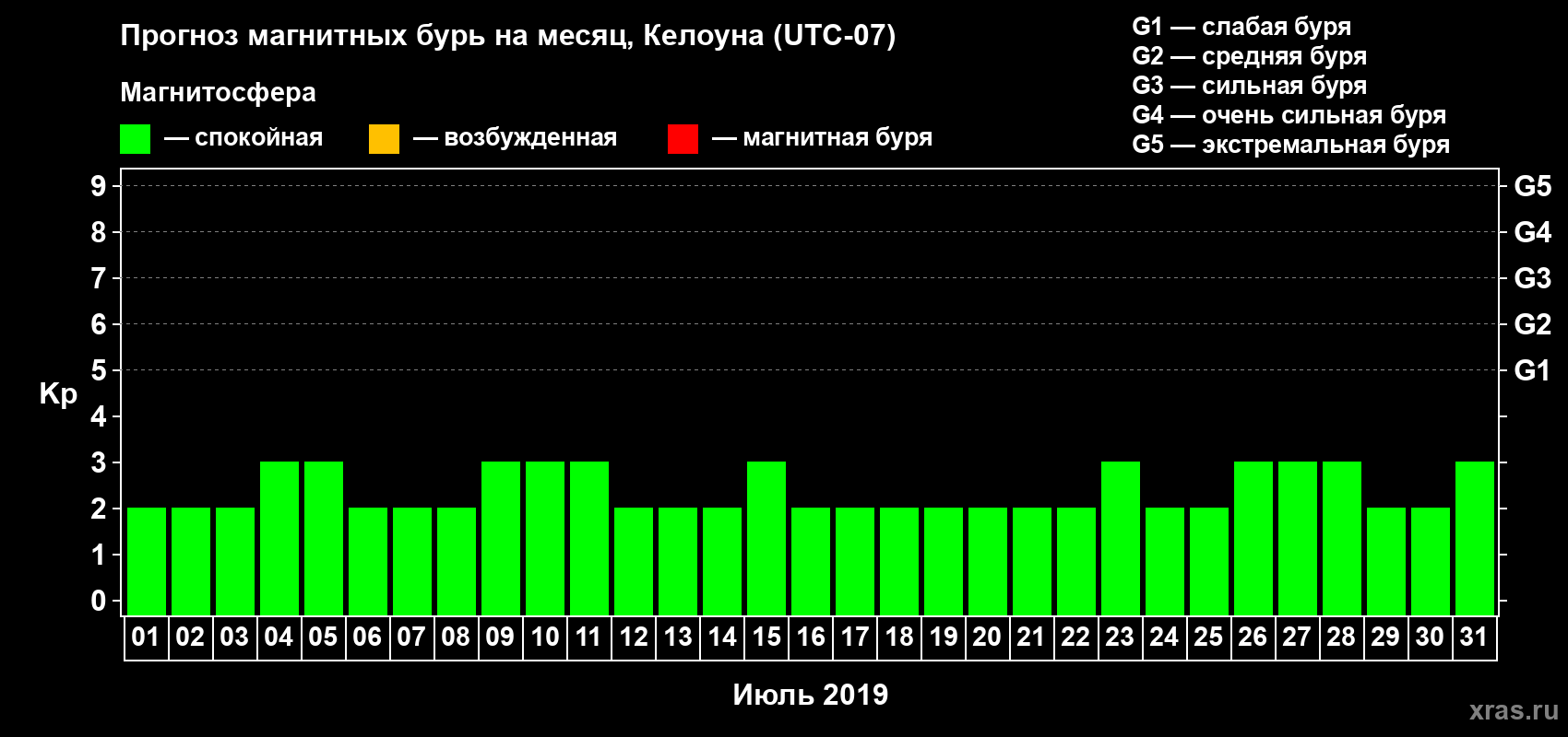 Прогноз магнитных бурь в Келоуне на 1 июля 2019 года