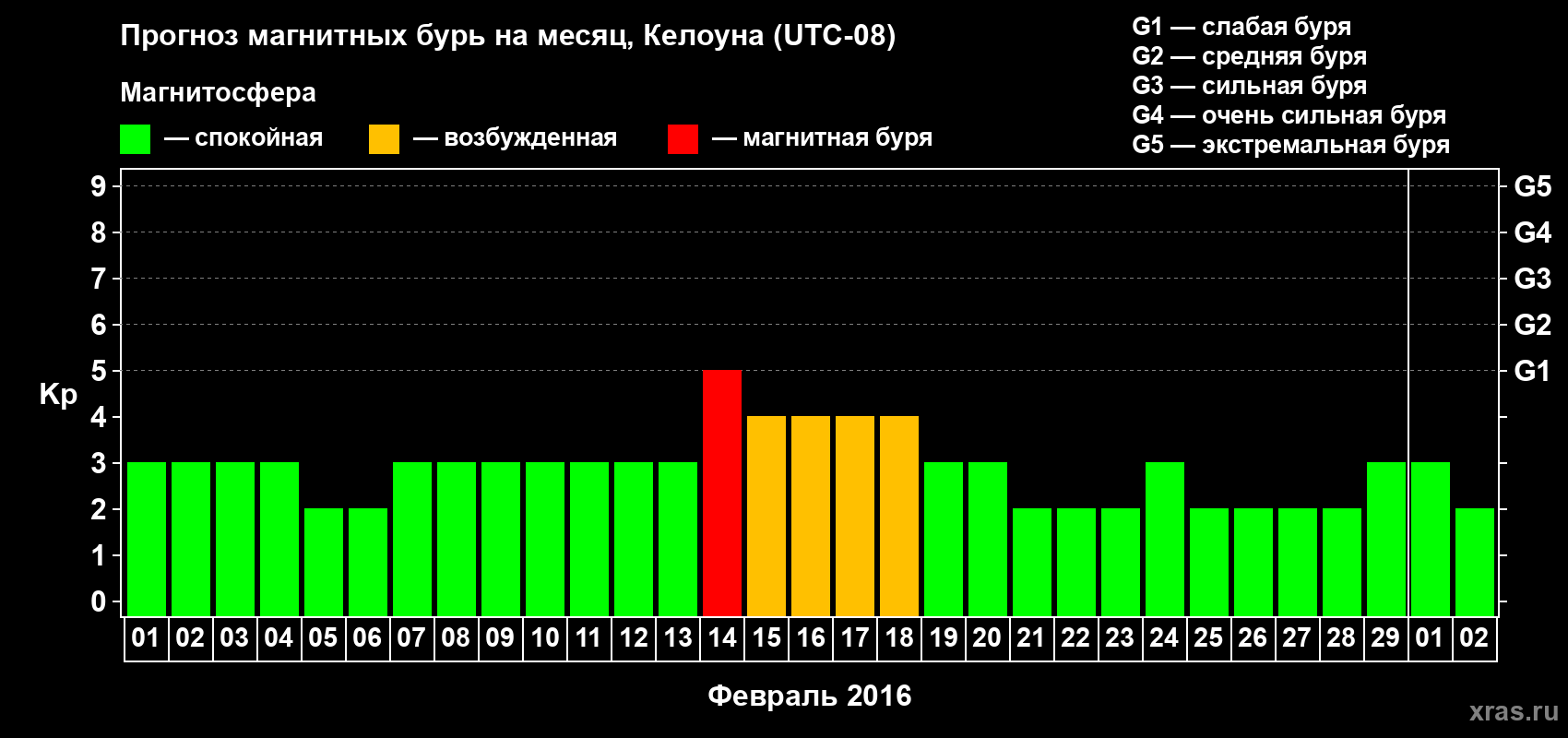 Прогноз магнитных бурь в Келоуне на 1 февраля 2016 года