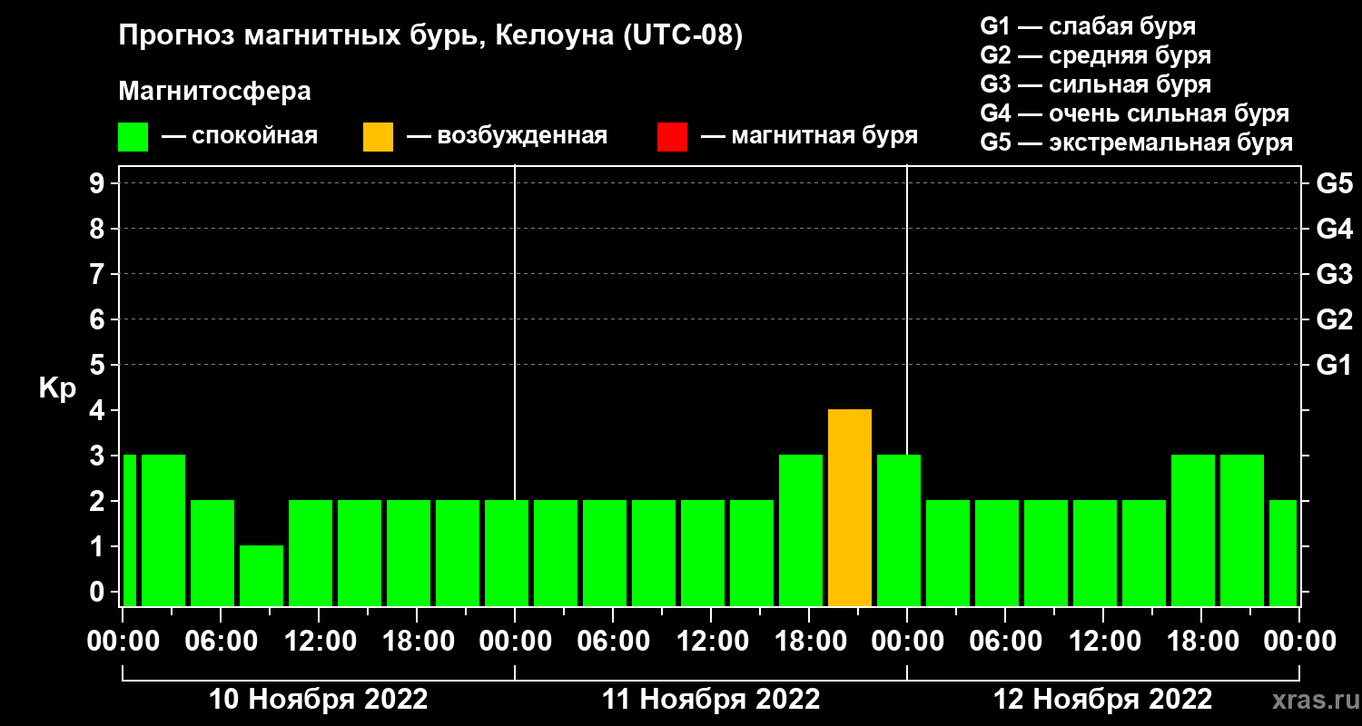 Прогноз магнитных бурь в Келоуне на 10 ноября 2022 года