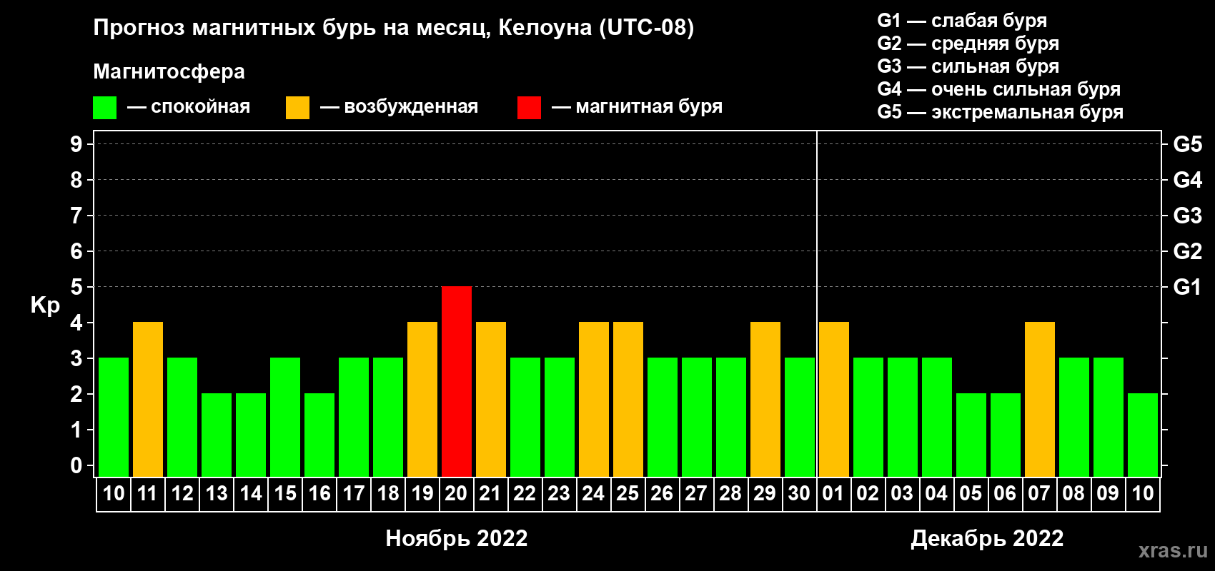 Прогноз магнитных бурь в Келоуне — 10 ноября 2022 года