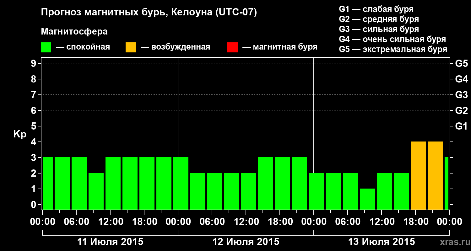 Прогноз магнитных бурь в Келоуне на 11 июля 2015 года