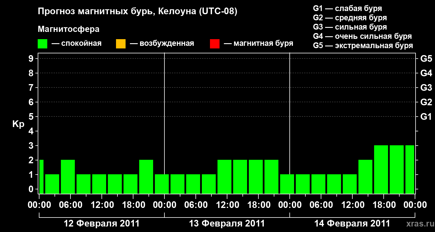 Прогноз магнитных бурь в Келоуне на 12 февраля 2011 года