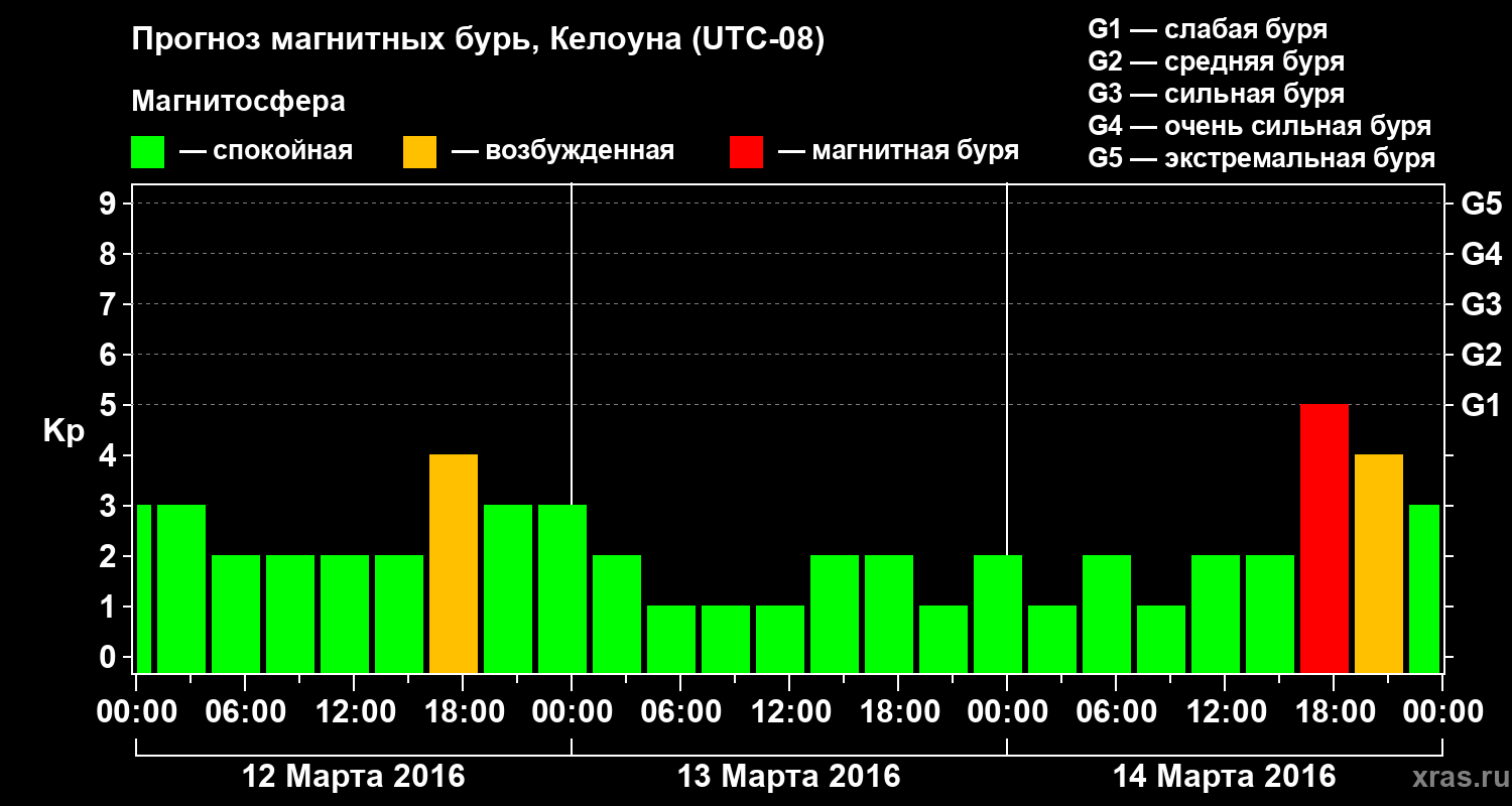 Прогноз магнитных бурь в Келоуне на 12 марта 2016 года