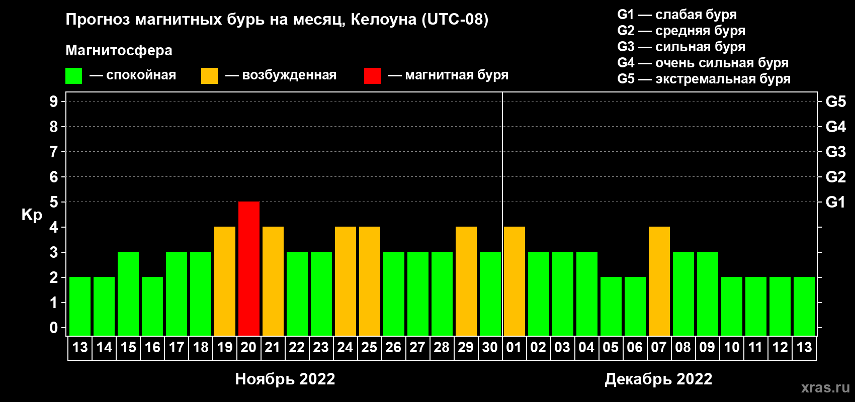 Прогноз магнитных бурь в Келоуне на 13 ноября 2022 года
