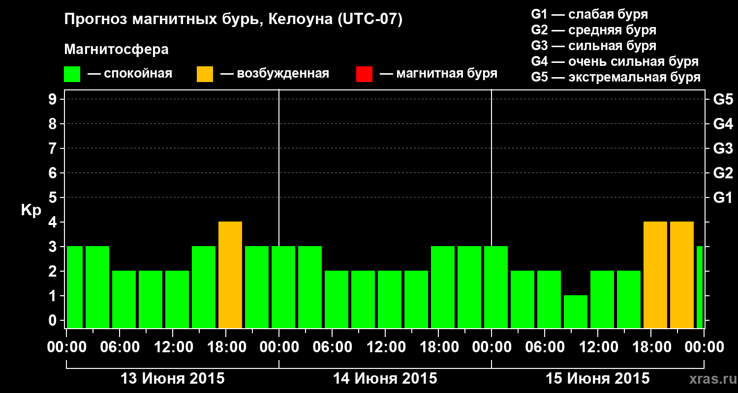 Прогноз магнитных бурь в Келоуне на 13 июня 2015 года