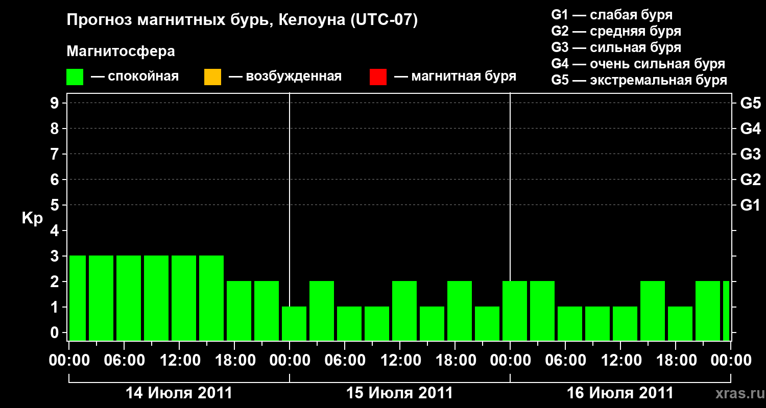 Прогноз магнитных бурь в Келоуне на 14 июля 2011 года