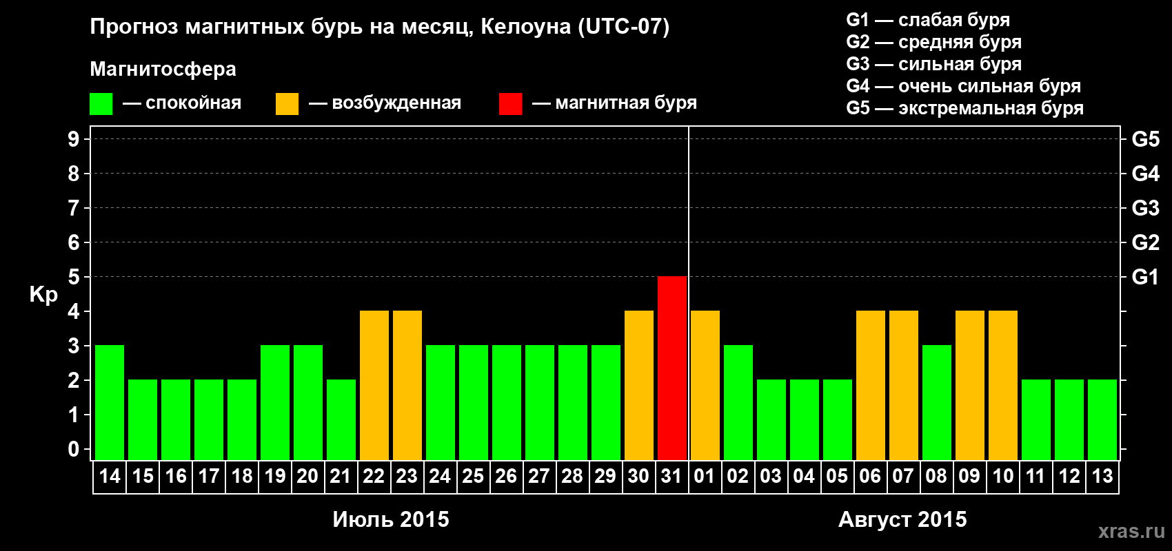 Прогноз магнитных бурь в Келоуне на 14 июля 2015 года