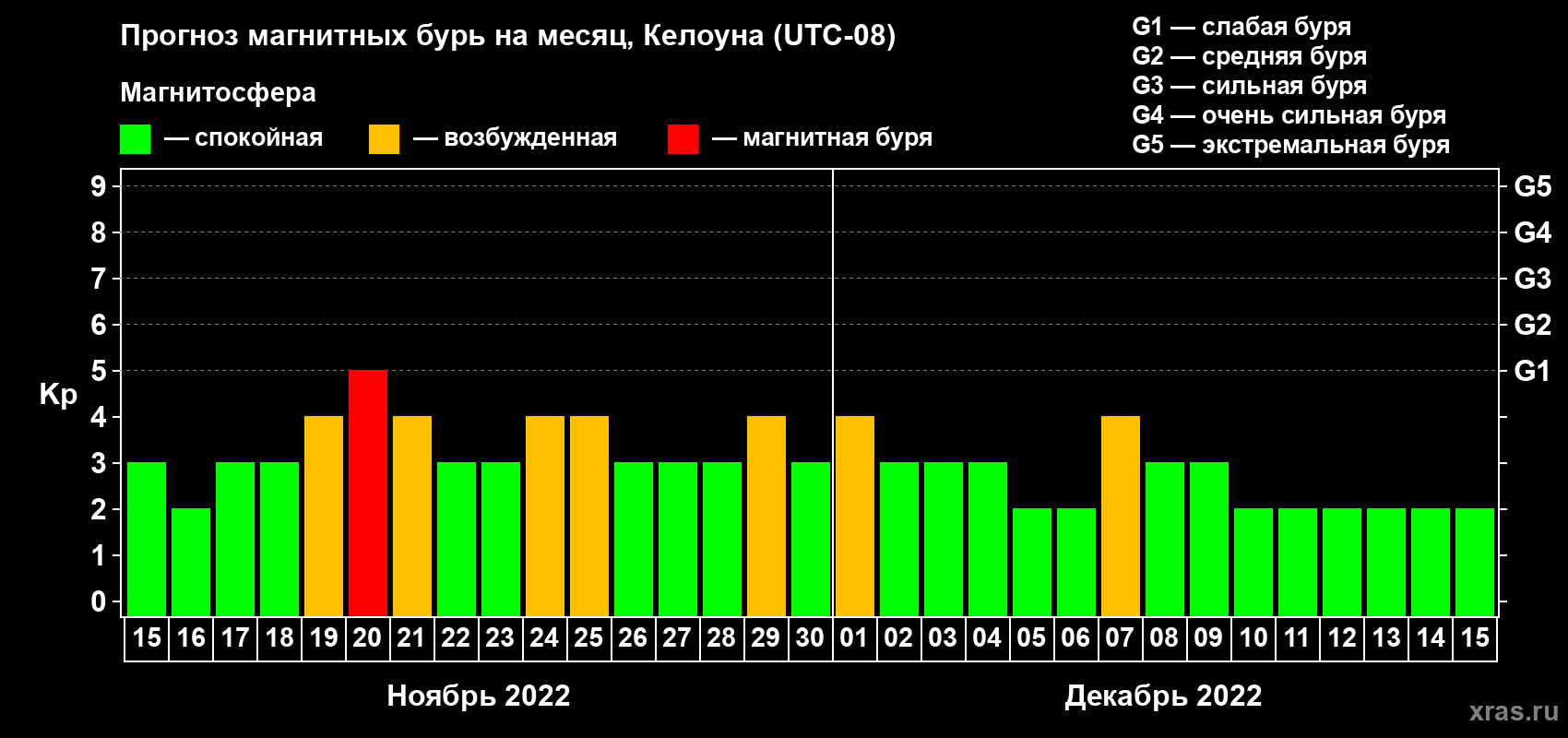 Прогноз магнитных бурь в Келоуне на 15 ноября 2022 года