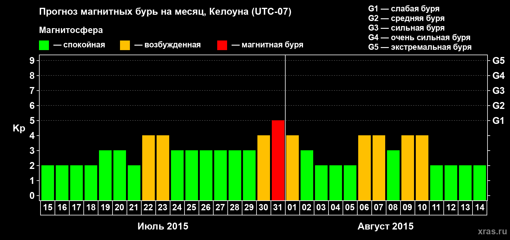 Прогноз магнитных бурь в Келоуне на 15 июля 2015 года