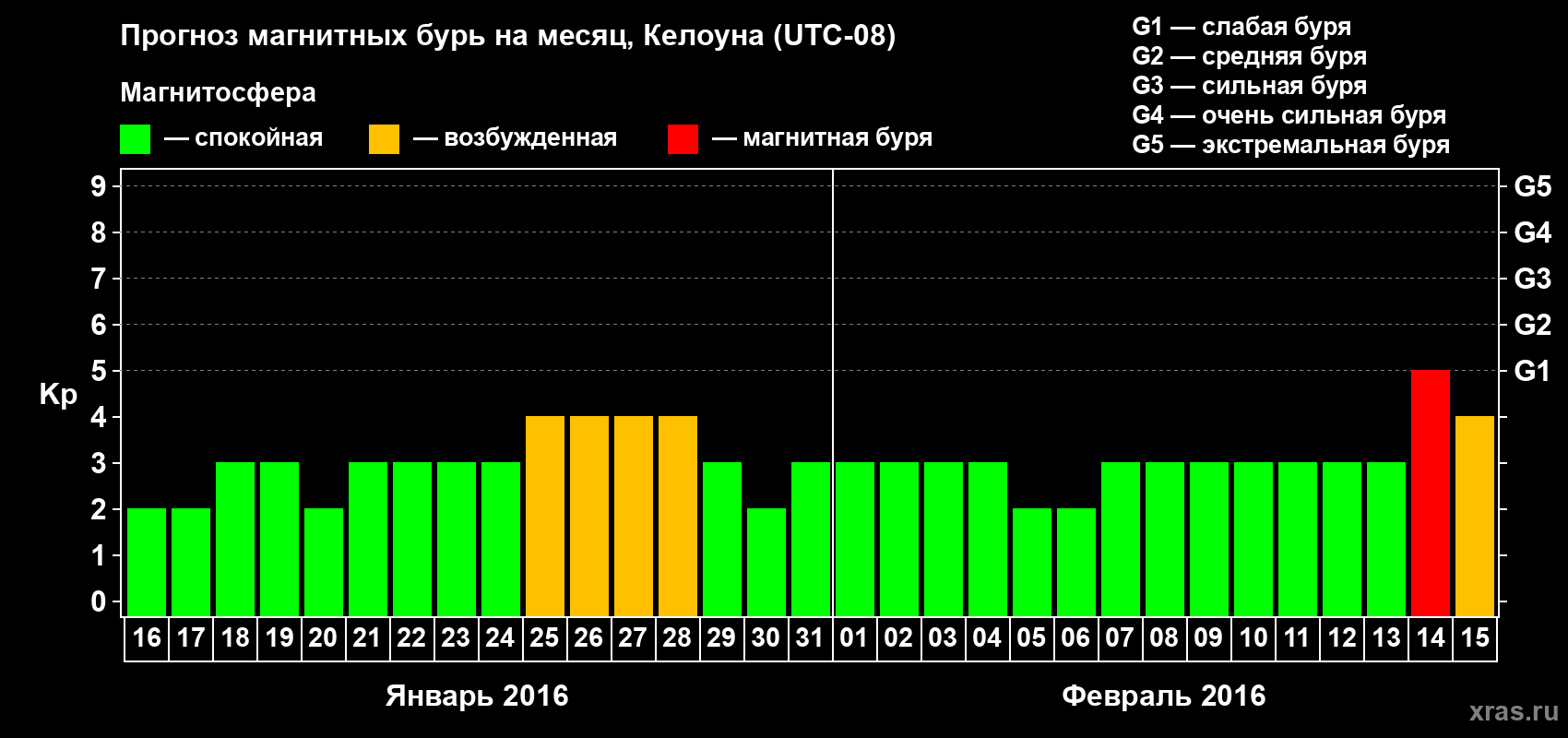 Прогноз магнитных бурь в Келоуне на 16 января 2016 года