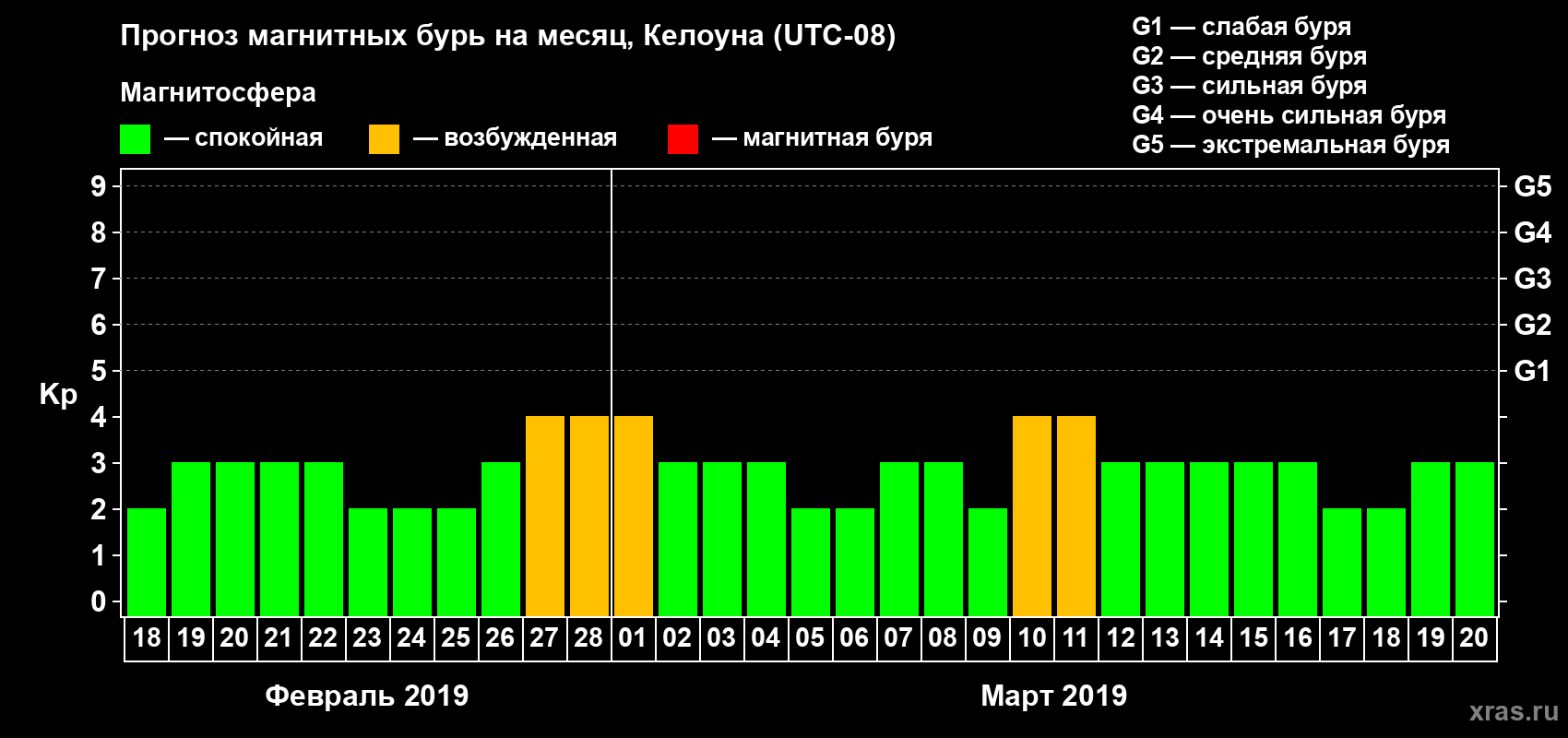 Прогноз магнитных бурь в Келоуне на 18 февраля 2019 года