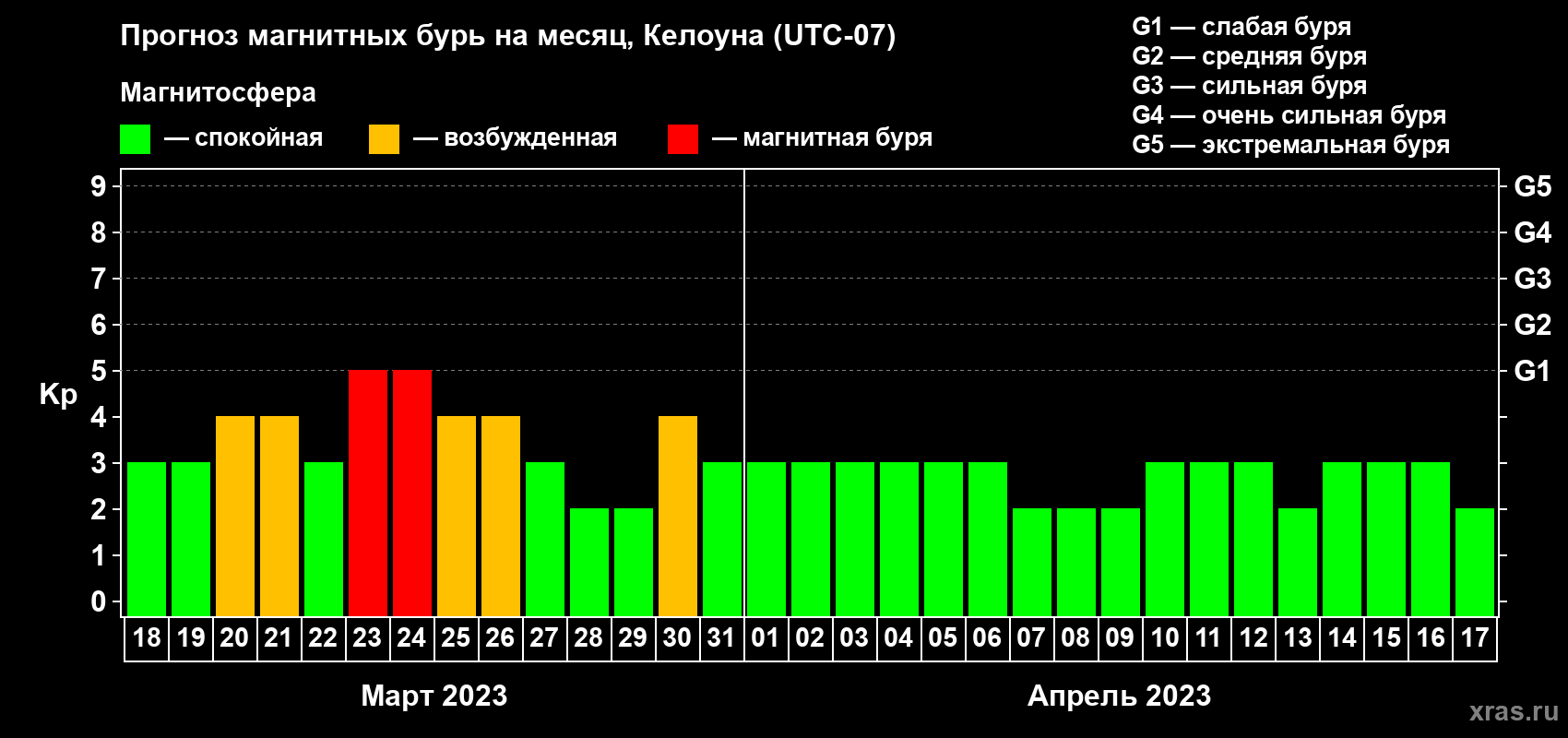 Прогноз магнитных бурь в Келоуне на 18 марта 2023 года