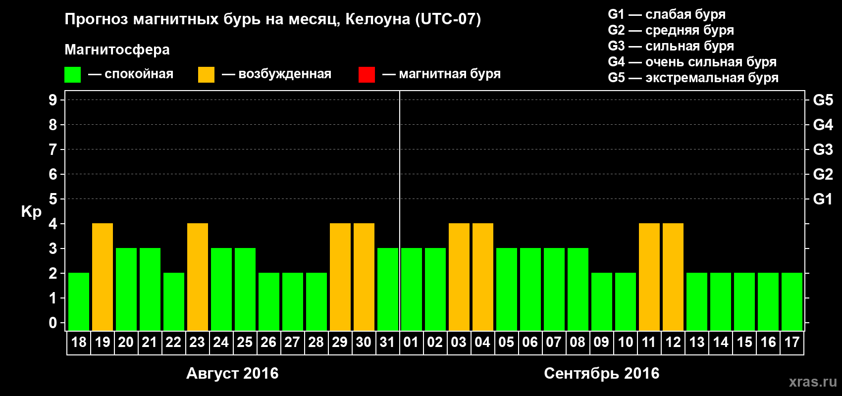 Прогноз магнитных бурь в Келоуне на 18 августа 2016 года