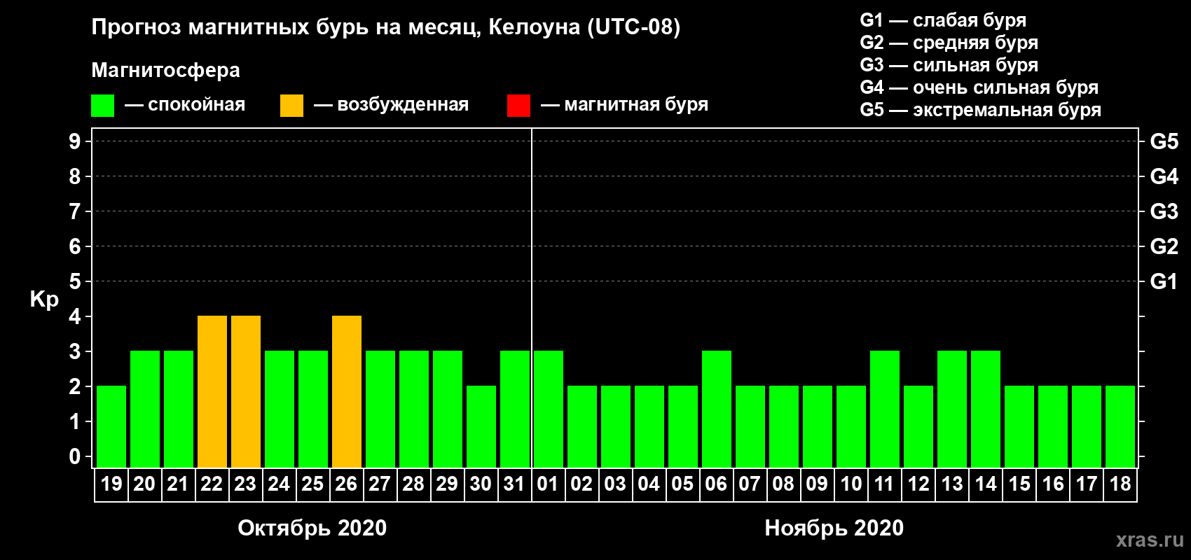Прогноз магнитных бурь в Келоуне — 19 октября 2020 года