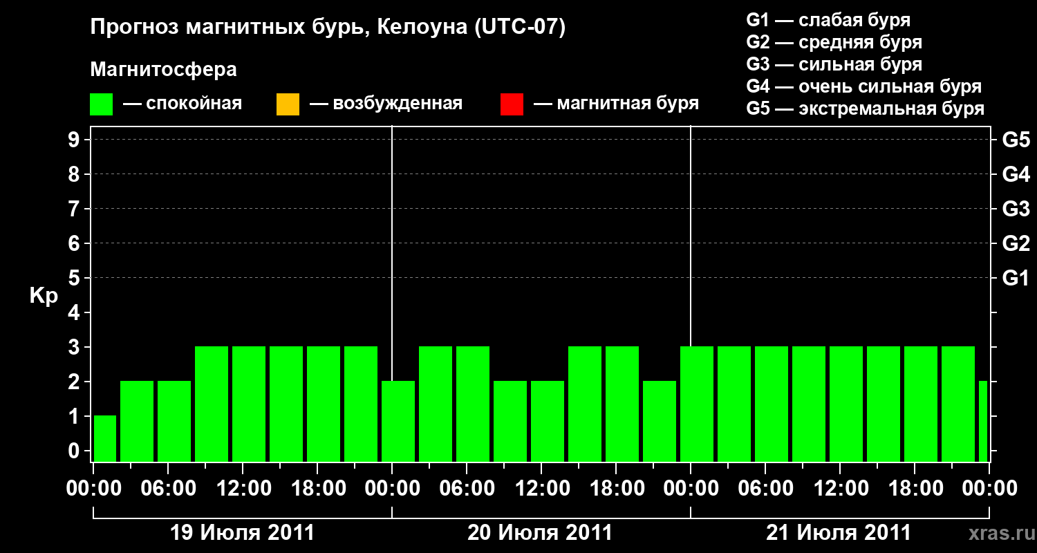 Прогноз магнитных бурь в Келоуне на 19 июля 2011 года