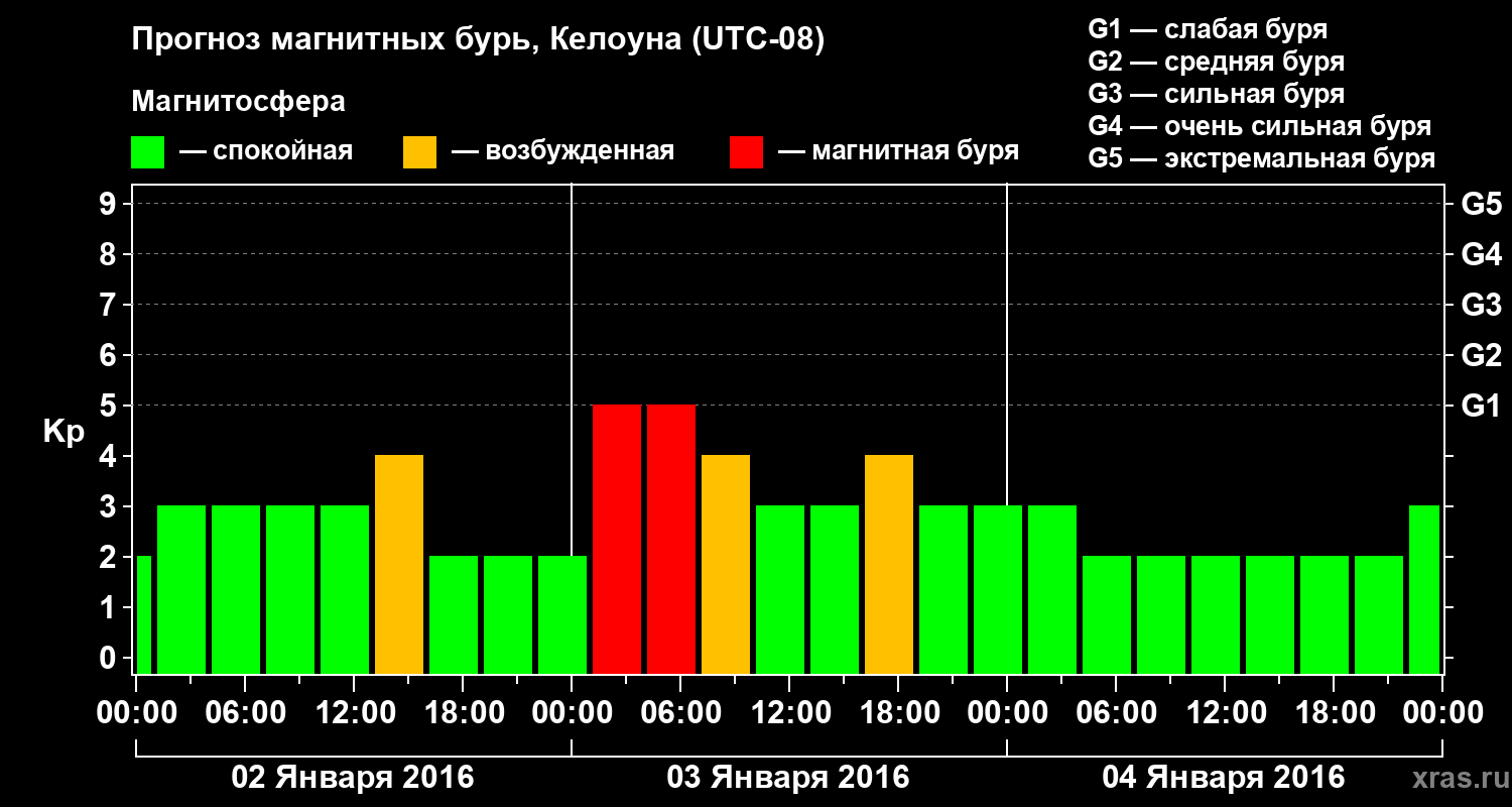 Прогноз магнитных бурь в Келоуне на 2 января 2016 года