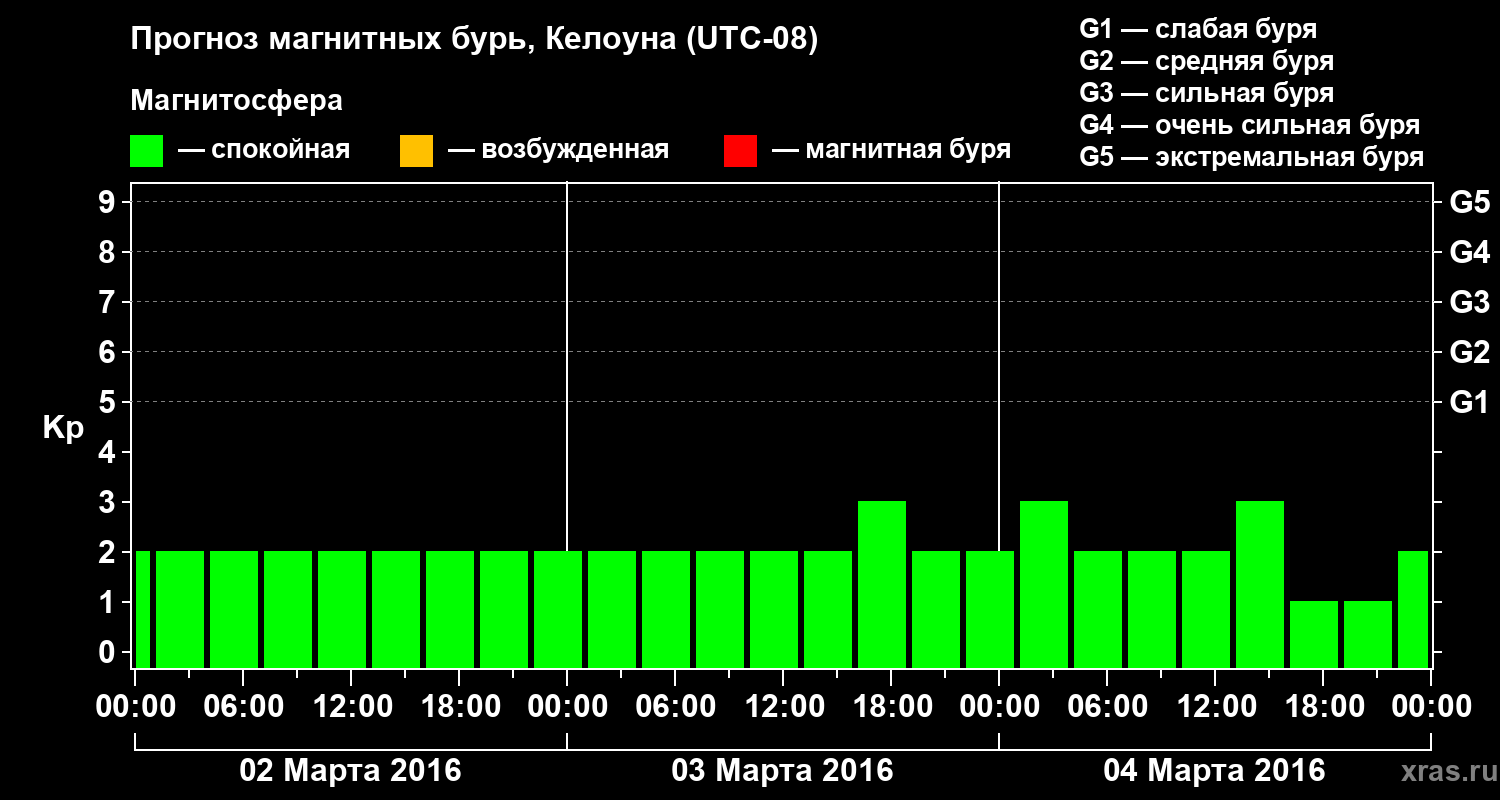 Прогноз магнитных бурь в Келоуне на 2 марта 2016 года